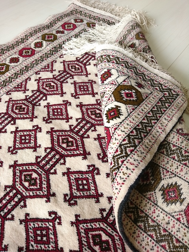 イラン製 5年程前に手織りされた、トルクメンデザインの未使用 ペルシャ絨毯 / ラグです。 アイボリー / オフホワイトをベースに赤・カーキ・黒のシンプルな柄が細かく丁寧に織り込まれています。 シンプルですが、カーキと赤のカラーコンビネーションがクールなインパクトを与えている一枚。 お部屋のテイストを選ばずとても合わせやすいデザインと色味。 サイズもリビングルーム・ベッドルーム等のアクセントに取り入れやすく、大変重宝するサイズ感です。 薄い色のベースですのでウールの混じり毛で多少の汚れ感を感じるかもしれません。 またフリンジはシルクで長めに残してあり、一方が約10cm、もう一方は約15cmです。 ☽イラン製 ☽パイル: ウール100% ☽フリンジ: シルク ☽サイズ: 158x108cm (フリンジ除く) ☽厚み: 約8mm ☽未使用 ☽送料込み ☆商品の特性とご注意☆ -実物とスクリーン上の色味が違って見える場合もございます。 -手織りのため測る場所によってサイズに誤差があります。基本的には真ん中のサイズを記載しています。 -使い始めてしばらくは遊び毛が落ちることがあります。 -羊毛のにおいが気になるかもしれませんが、使用していくうちに薄れていきます。 -ハンドメイドのラグは工場生産の既製品とは違いますので多少のゆがみ、色むらがあります。手織りの暖かみを楽しんでいただければ幸いです。 こちらの商品は折り畳んで発送いたします。