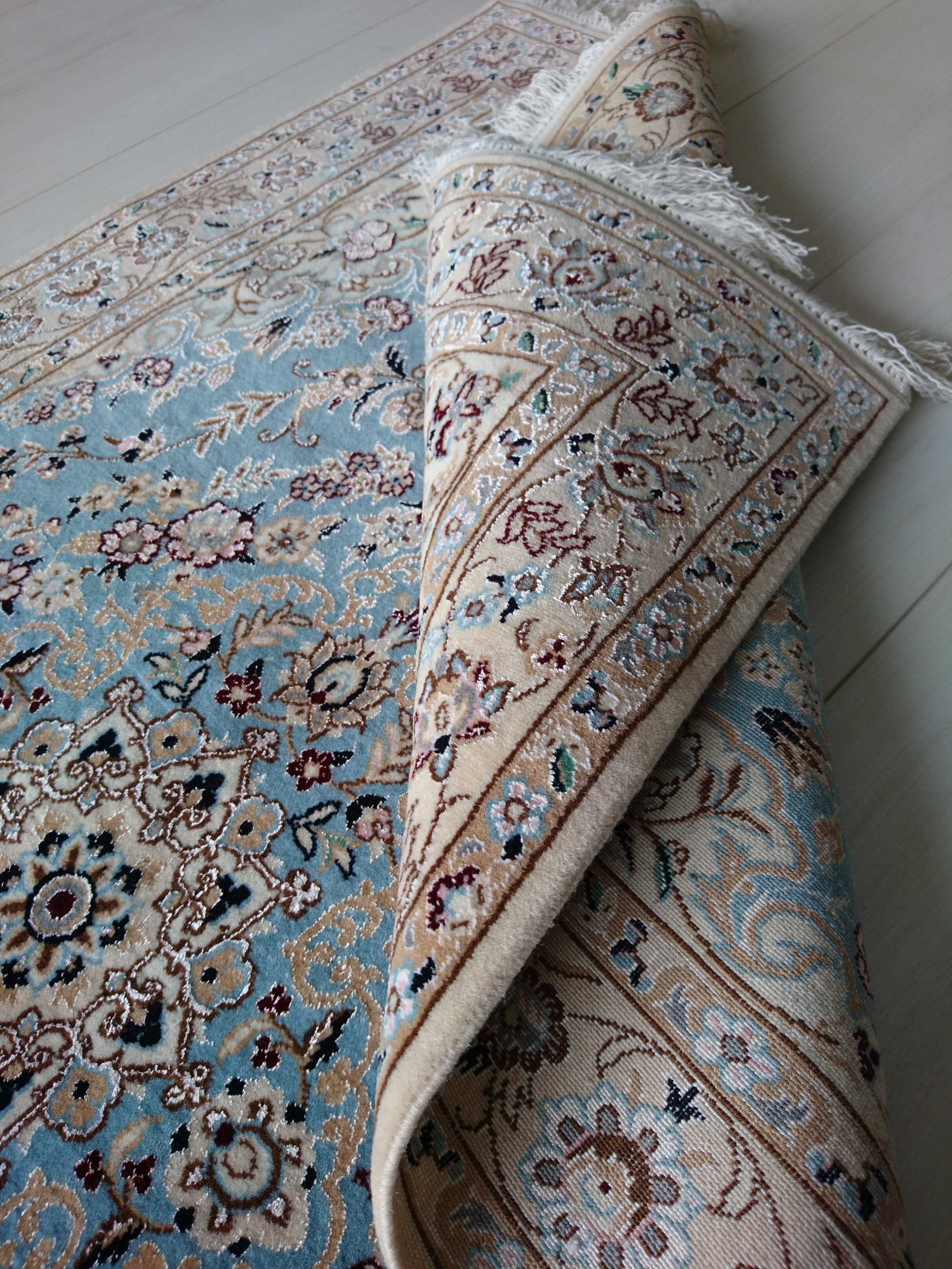 ベージュとターコイズブルー(ライトブルー)の2色をベースに、中央のメダリオン、散りばめられたお花の模様がこの上なく繊細で美しい一枚です。