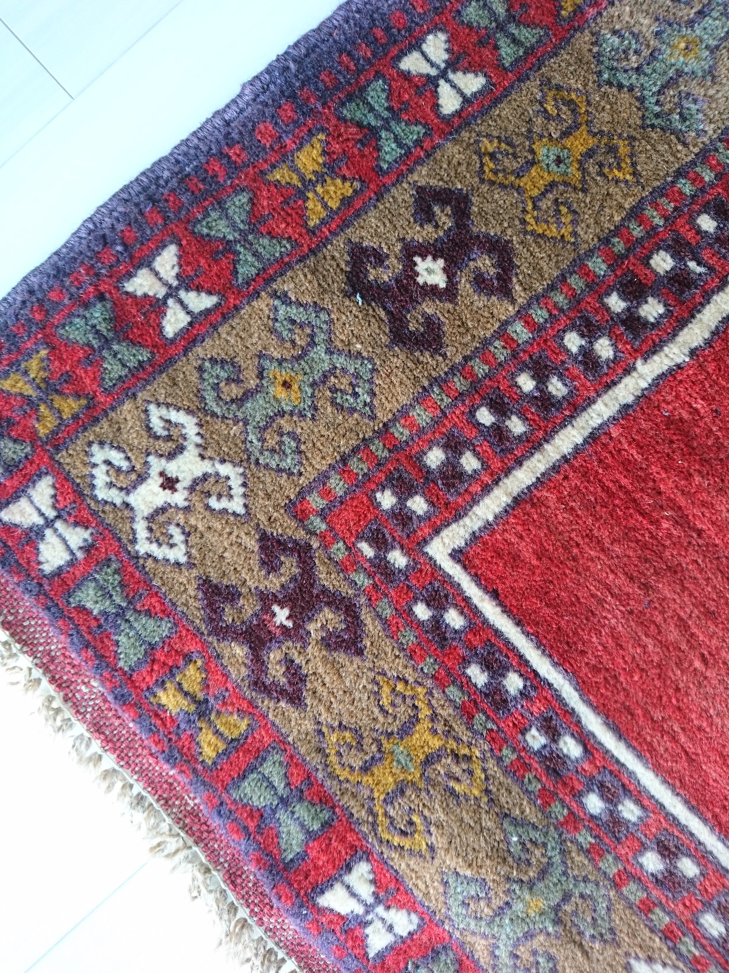 程よく褪せた落ち着いた色調の赤をベースに、オフホワイト、ブラウン、カーキなどのアースカラーでまとめられたモダンで合わせやすい一枚です。