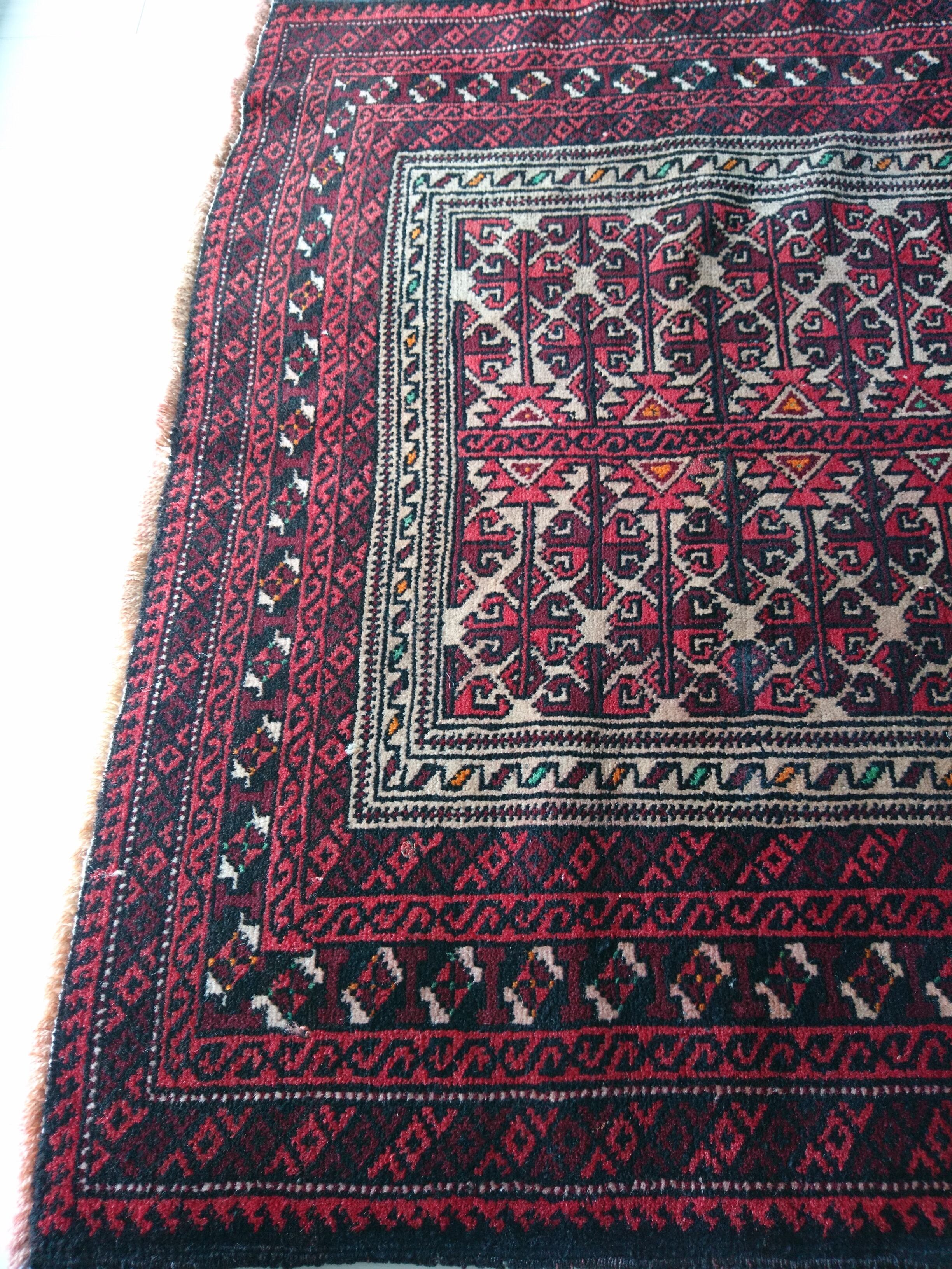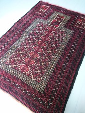 イラン製 50年以上前に手織りされた、バルーチデザインのプレイヤーラグ / ペルシャ絨毯です。