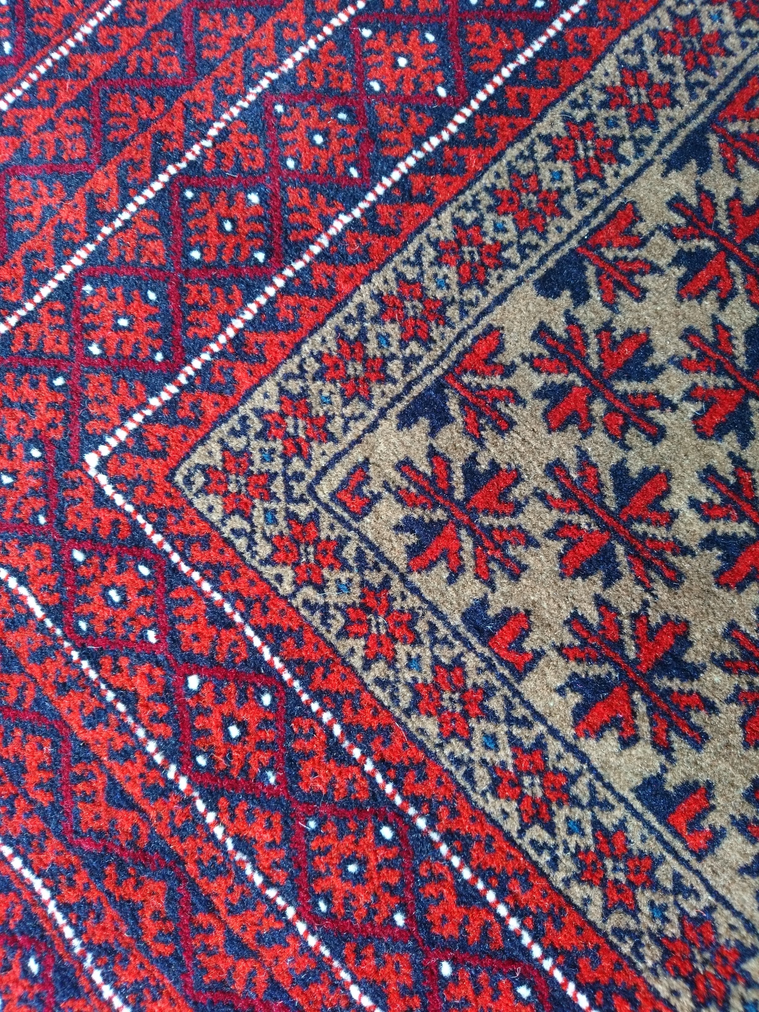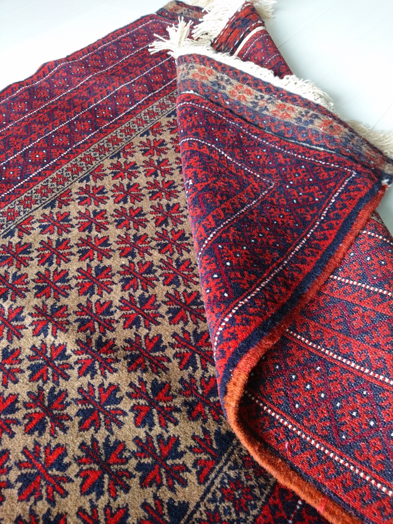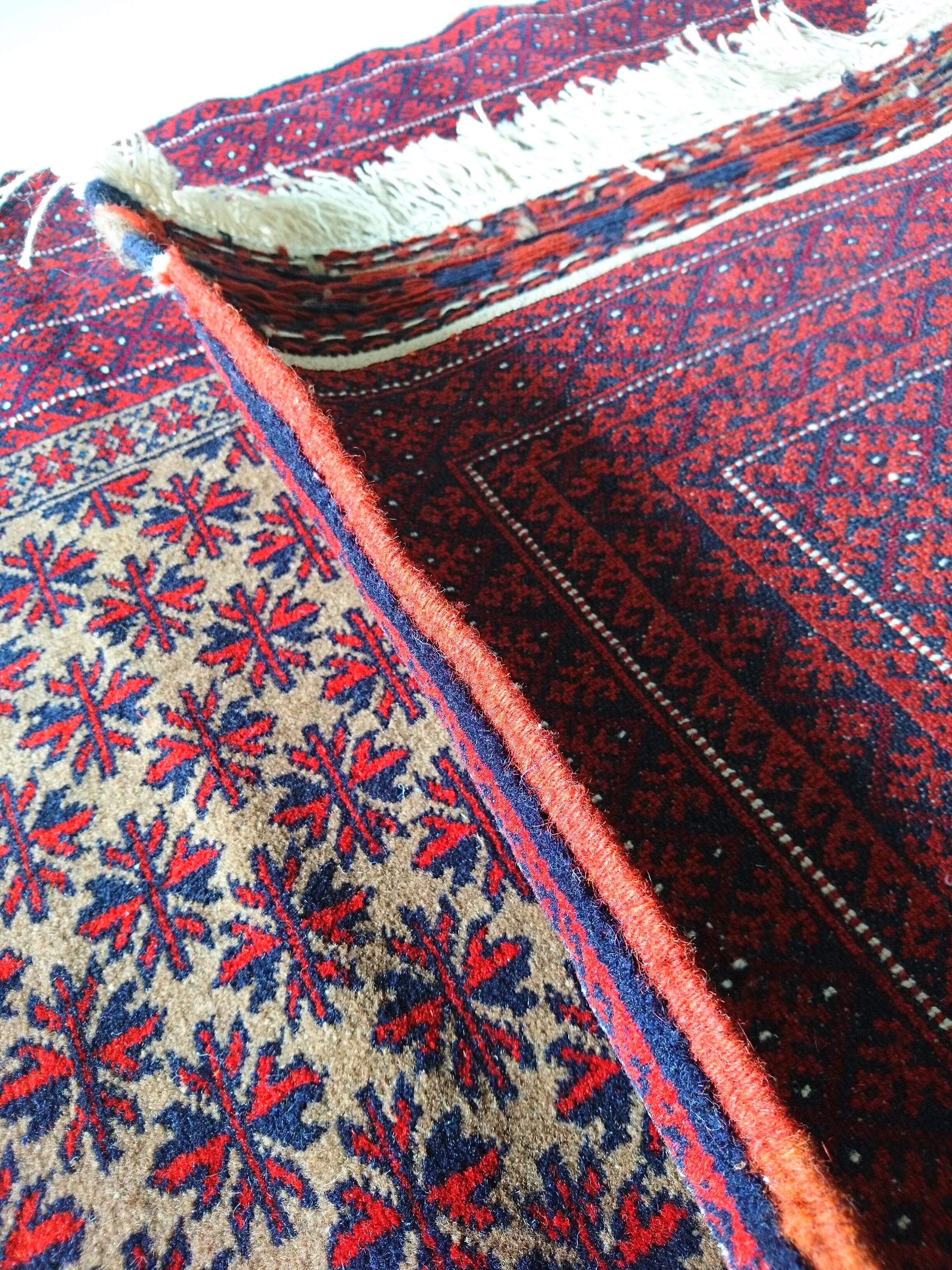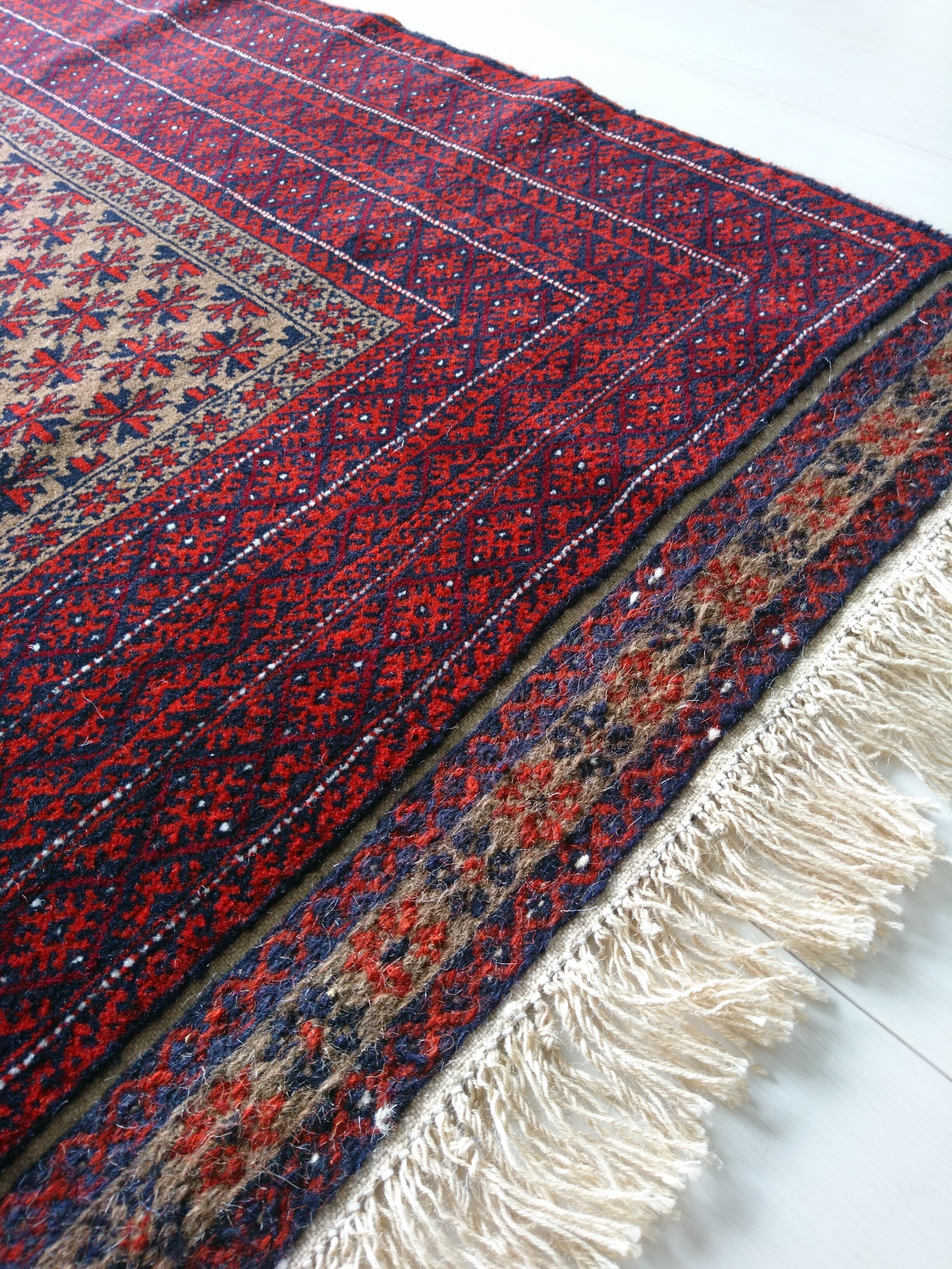 イラン製 バルーチ族によって丁寧に手織りされた、リビングサイズのペルシャ絨毯 / ラグです。