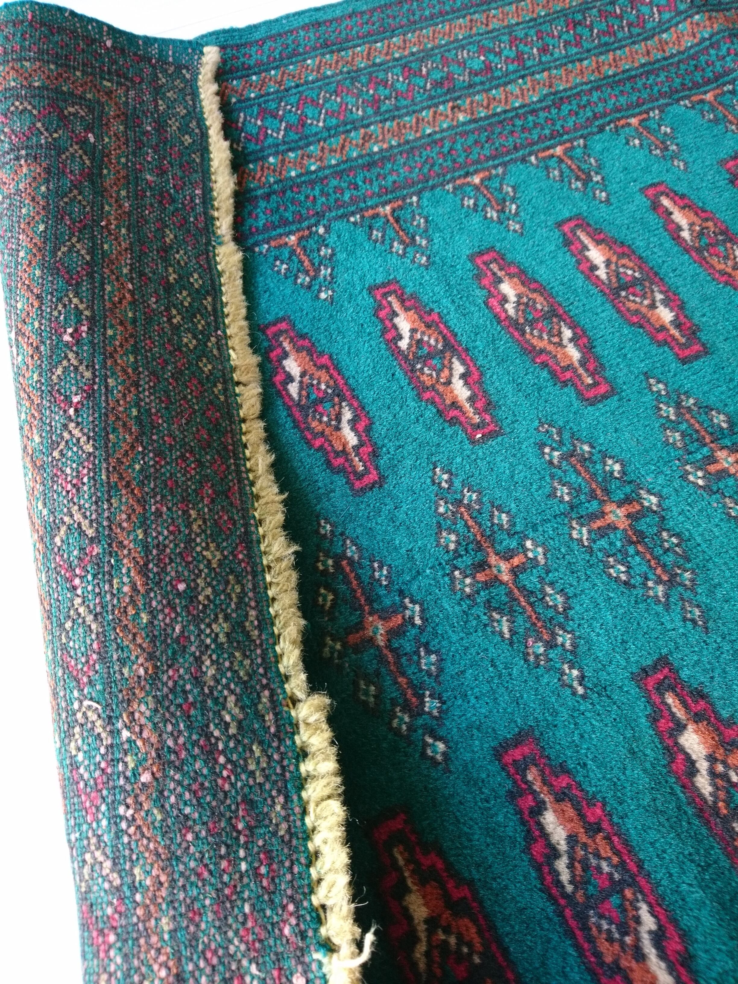 イラン製 60-70年前に丁寧に手織りされた、トルクメンデザインのセミアンティーク ヴィンテージ ペルシャ絨毯 / ラグです。