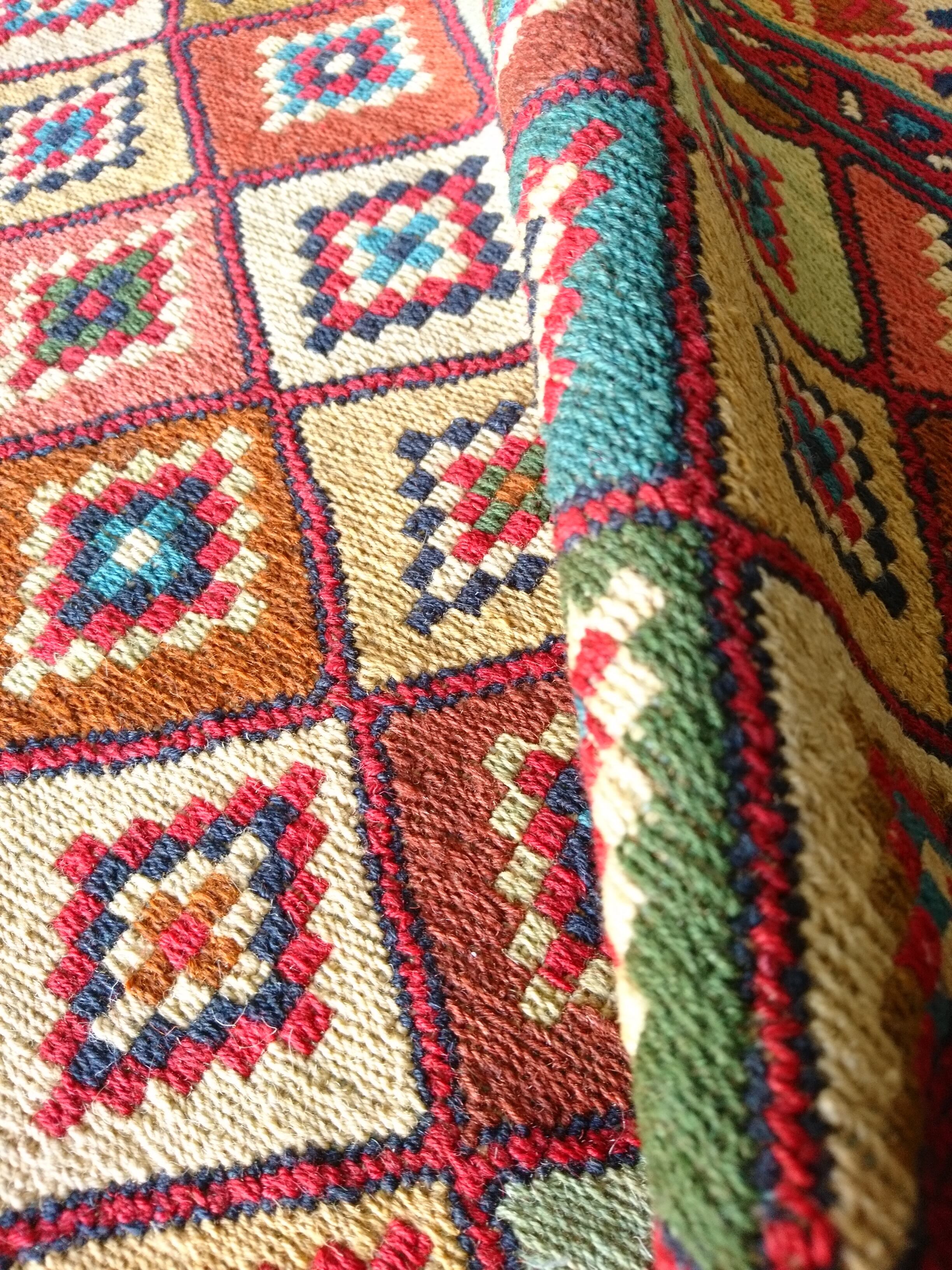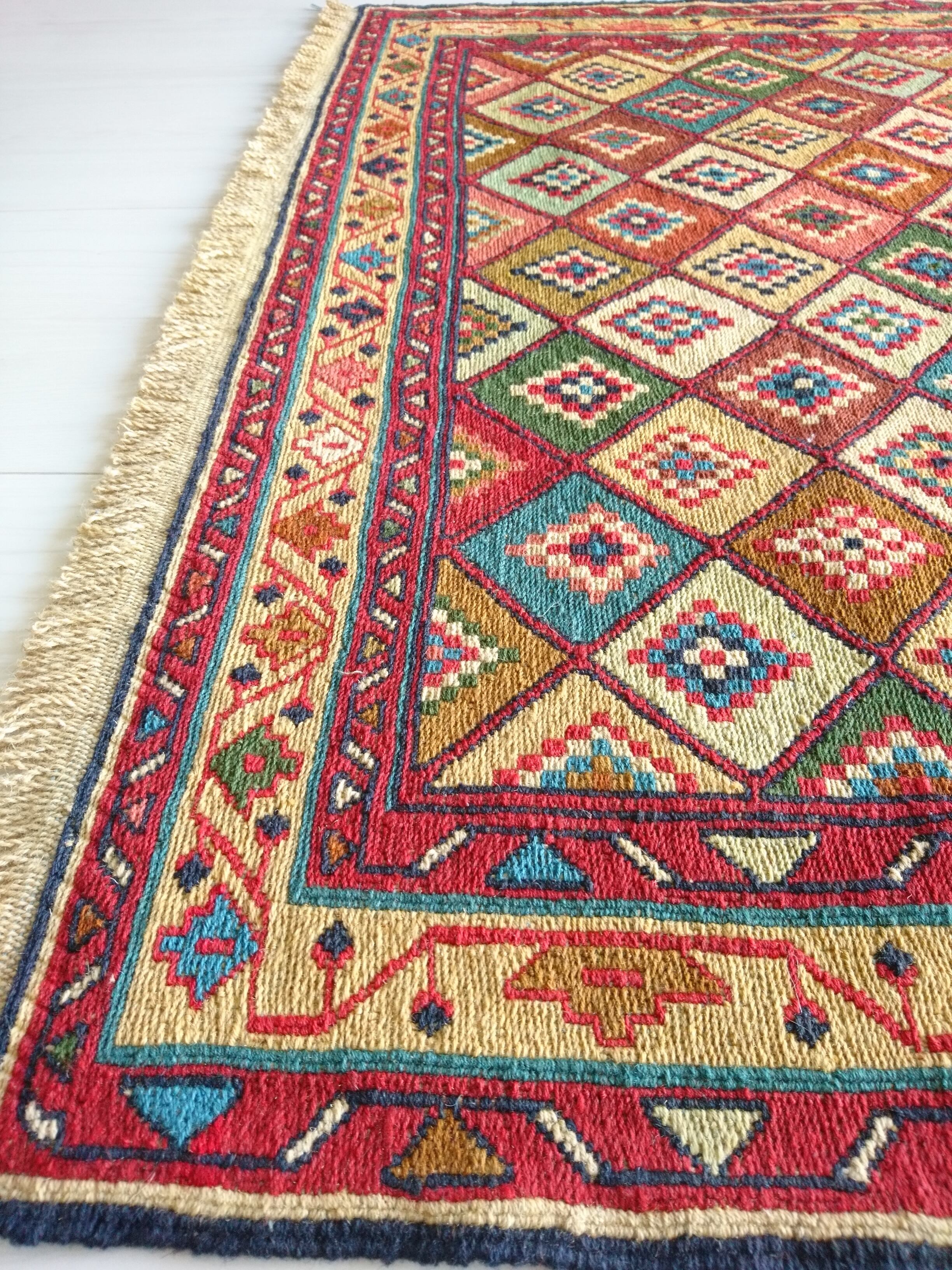 スマック織りで大変細かく丁寧に手織りされた一枚。 目が細かくある程度重みがあるのでしっかりと床に敷かれます。