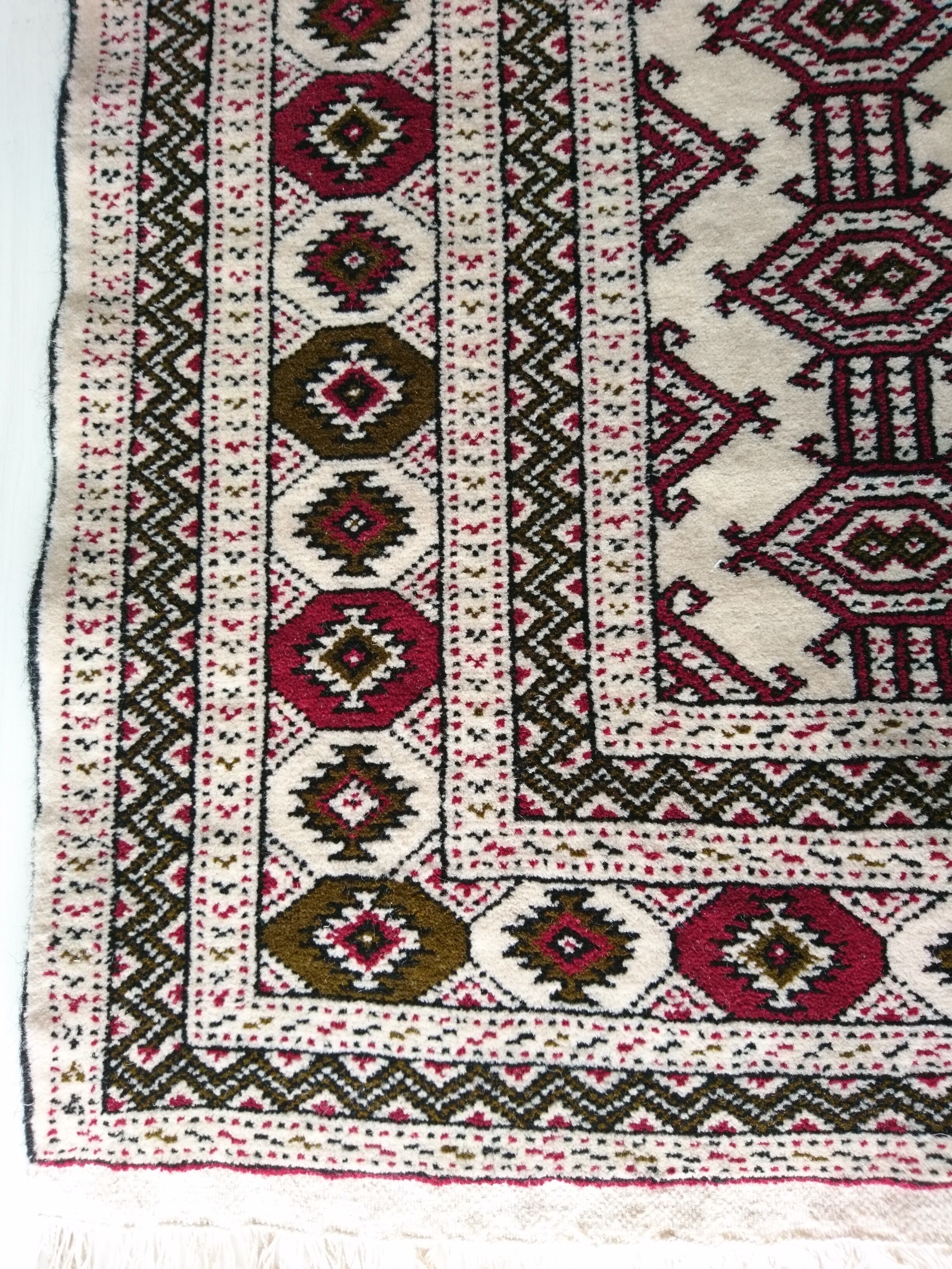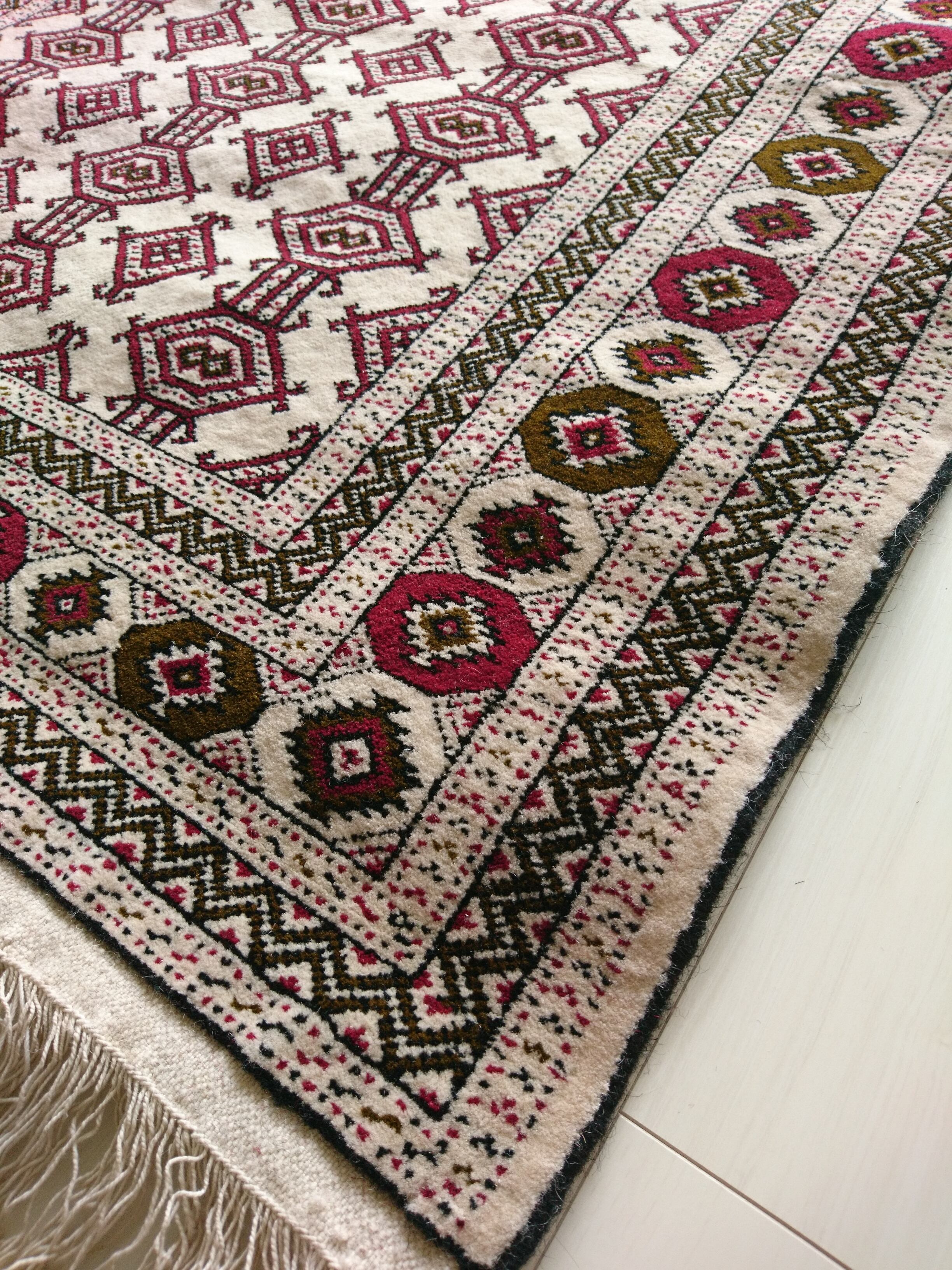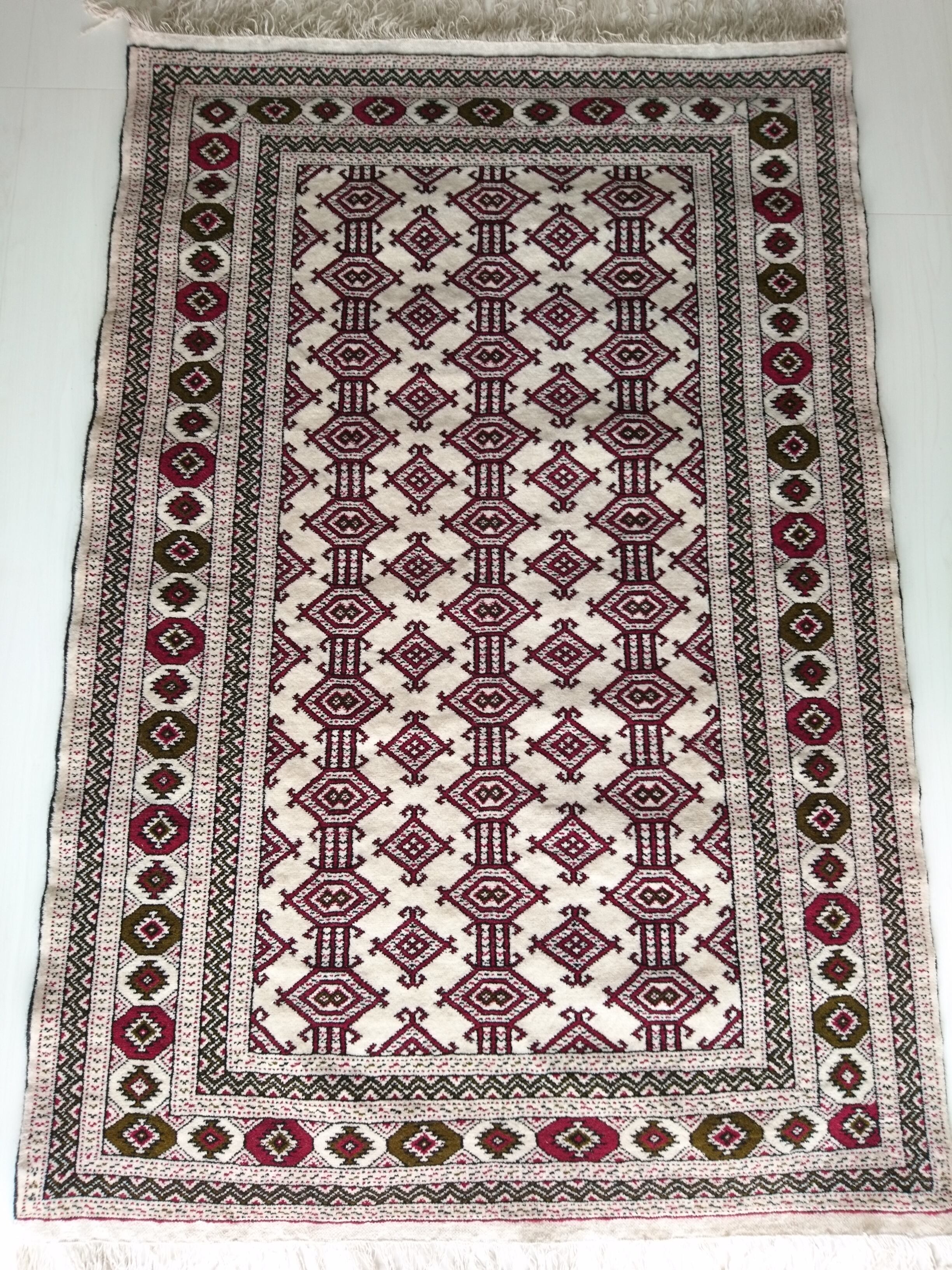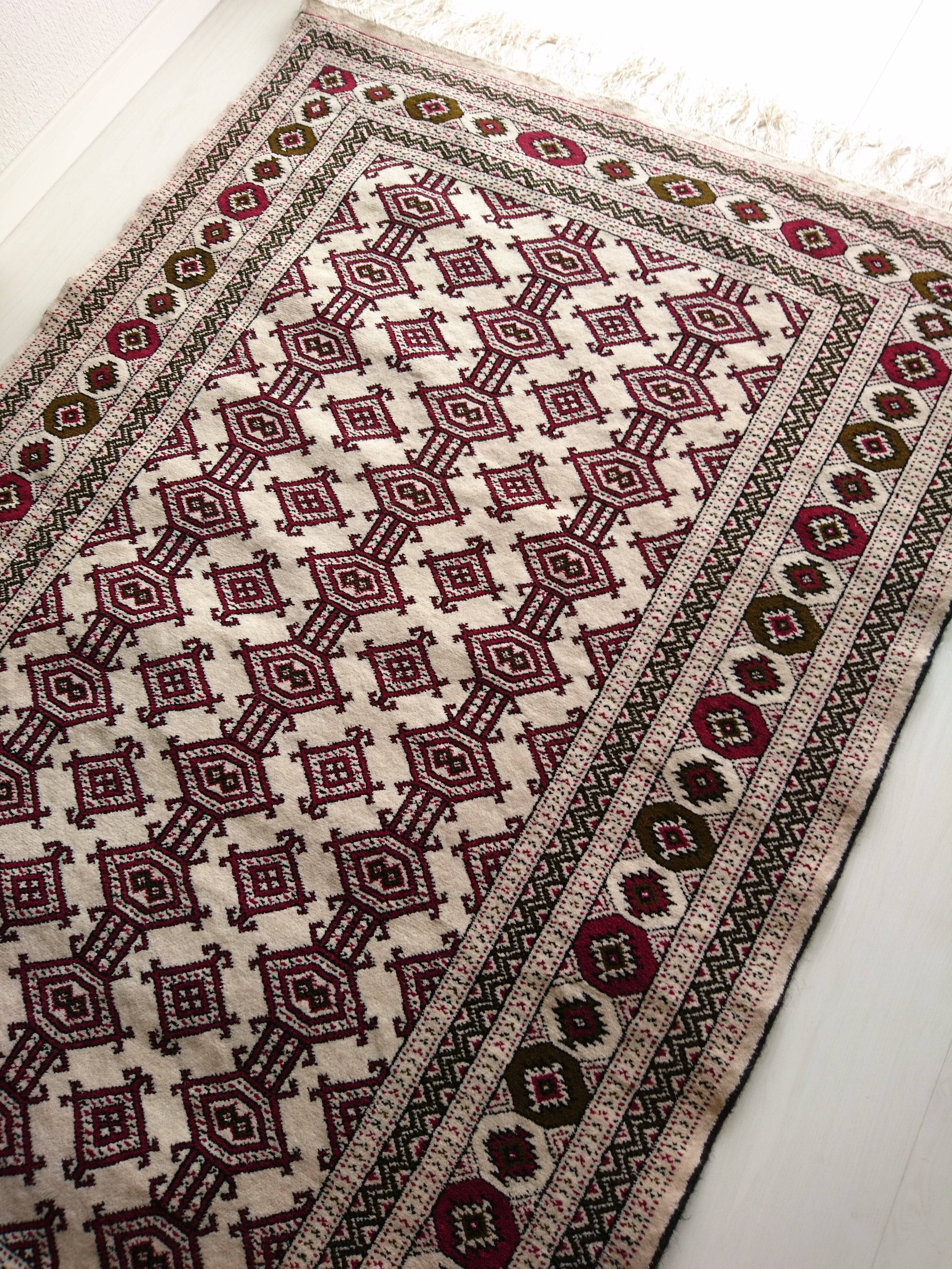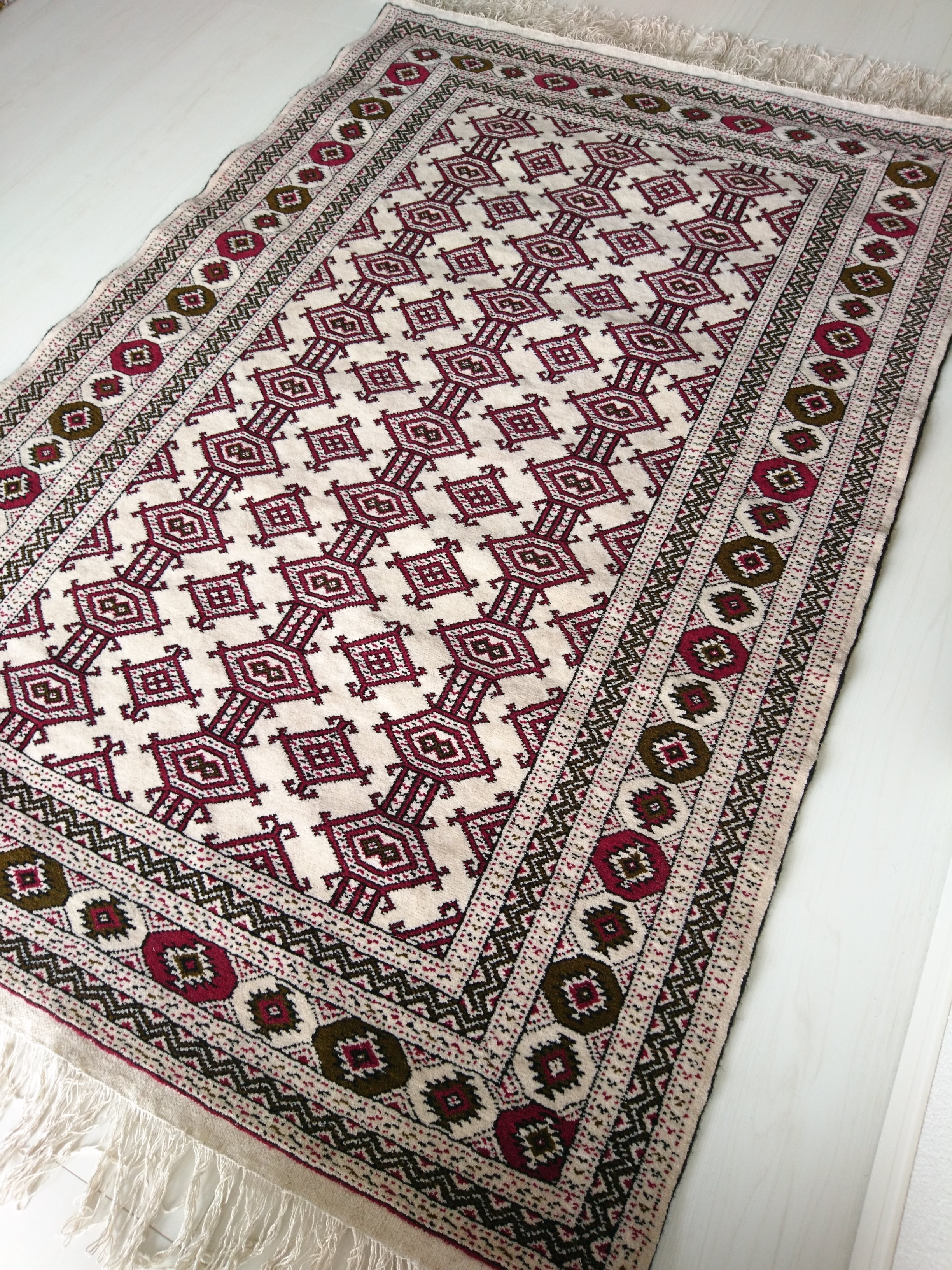 イラン製 5年程前に手織りされた、トルクメンデザインの未使用 ペルシャ絨毯 / ラグです。