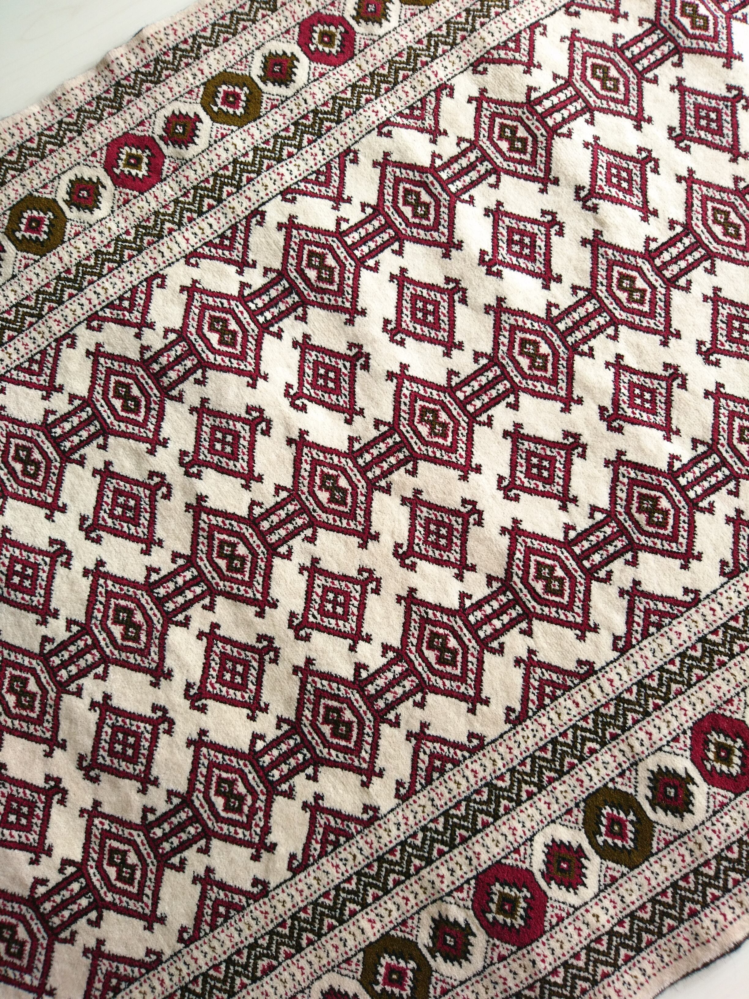 アイボリー / オフホワイトをベースに赤・カーキ・黒のシンプルな柄が細かく丁寧に織り込まれています。