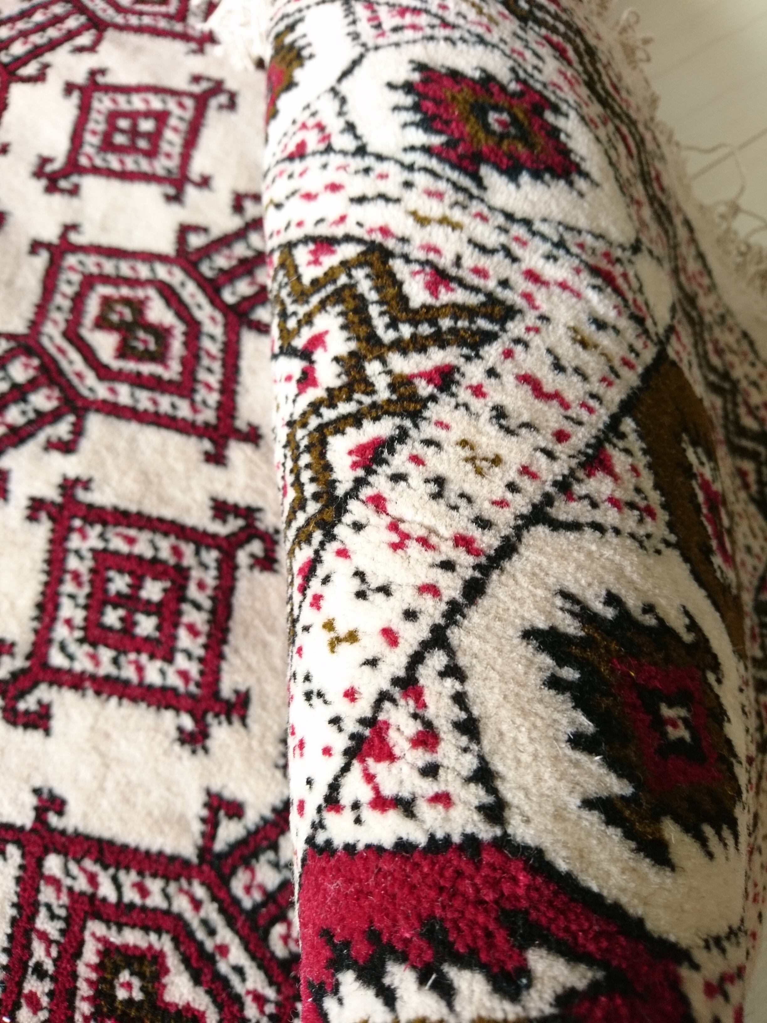 -ハンドメイドのラグは工場生産の既製品とは違いますので多少のゆがみ、色むらがあります。手織りの暖かみを楽しんでいただければ幸いです。