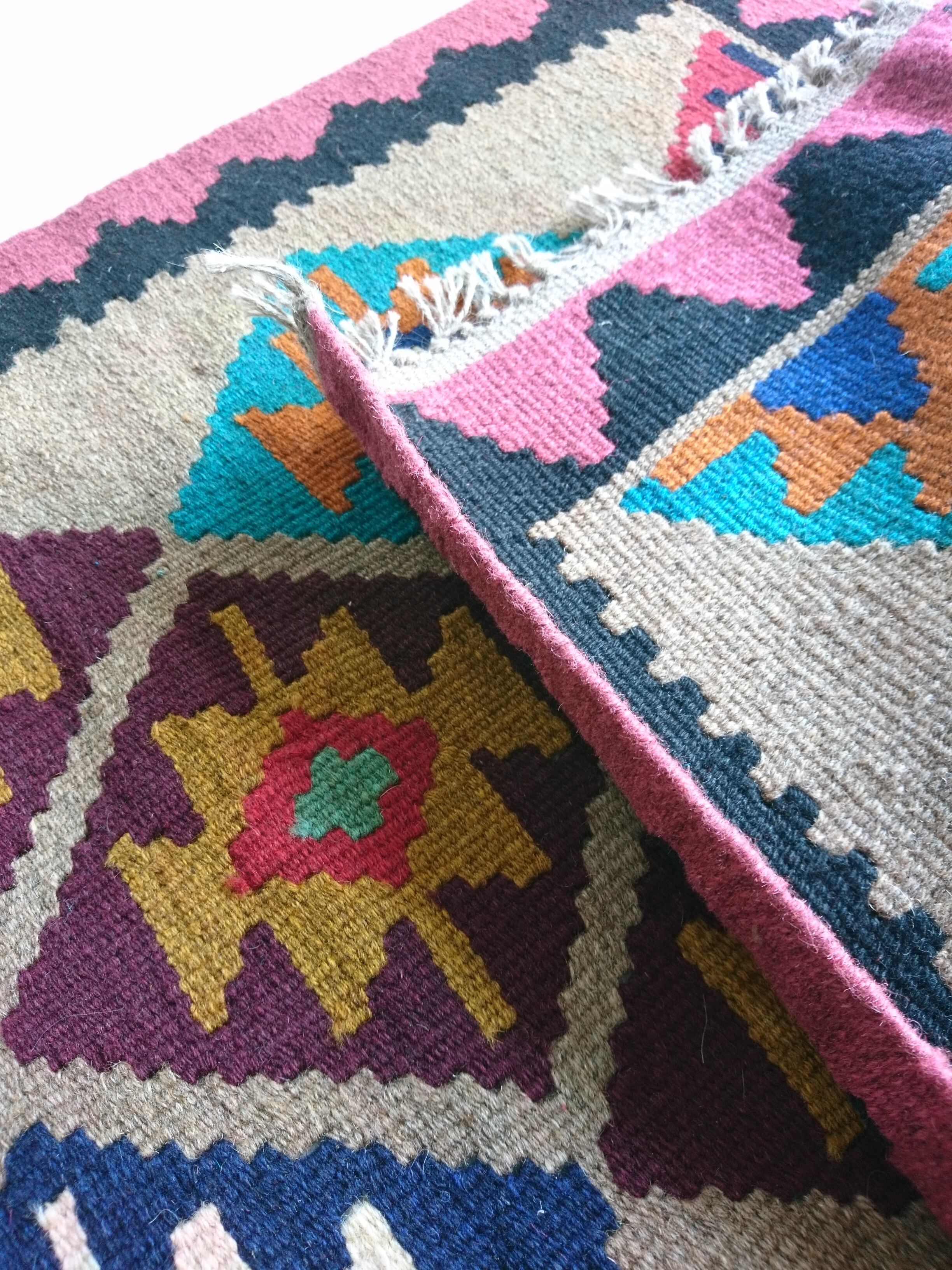 イラン北西部の都市 アルダビール近郊のヴィレッジ手織りされた、羊毛100%のキリムランナー / ラグです。