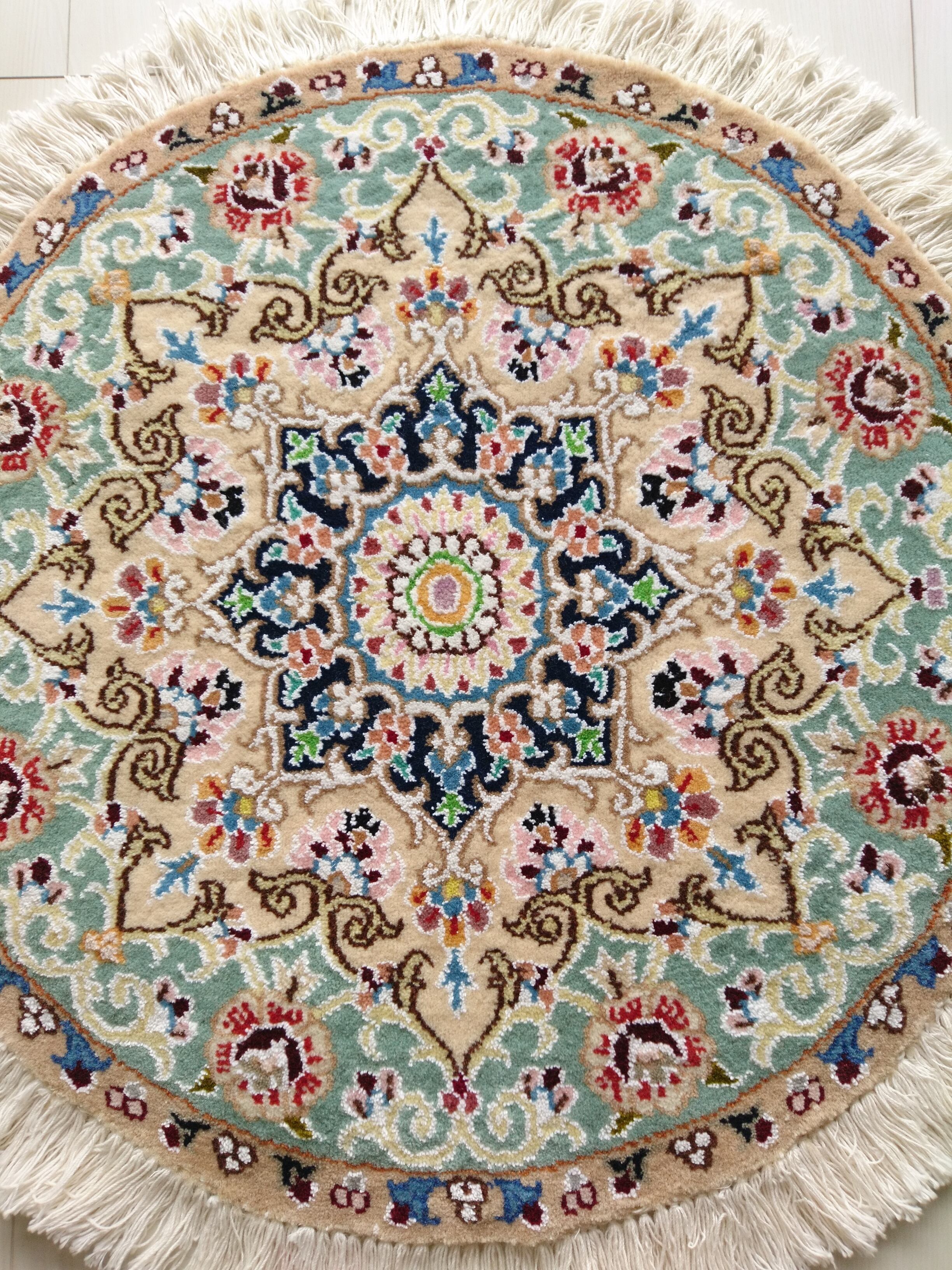 イラン製 ナイン産の、新品・手織り ラウンド ペルシャ絨毯 / ラグです。