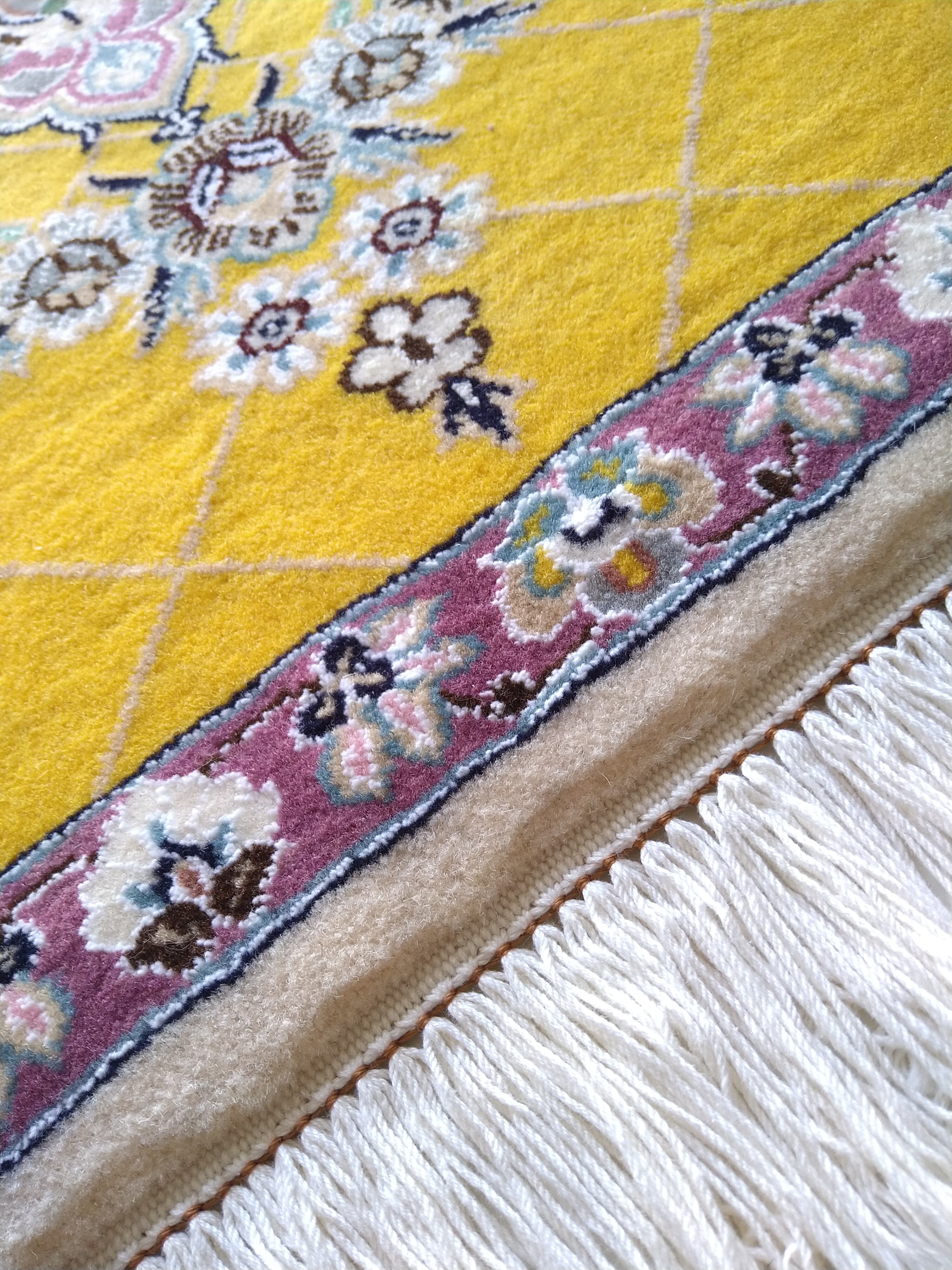 ベースは明るく濃い黄色で織られ、ラベンダーピンクのメダリオンがセンターに華やかです。 黄色のベース部分に優しいベージュでダイヤ柄が織り込まれているのがモダンなアクセント。 メダリオンとフレームのネイビーの縁取りが全体を引き締めています。