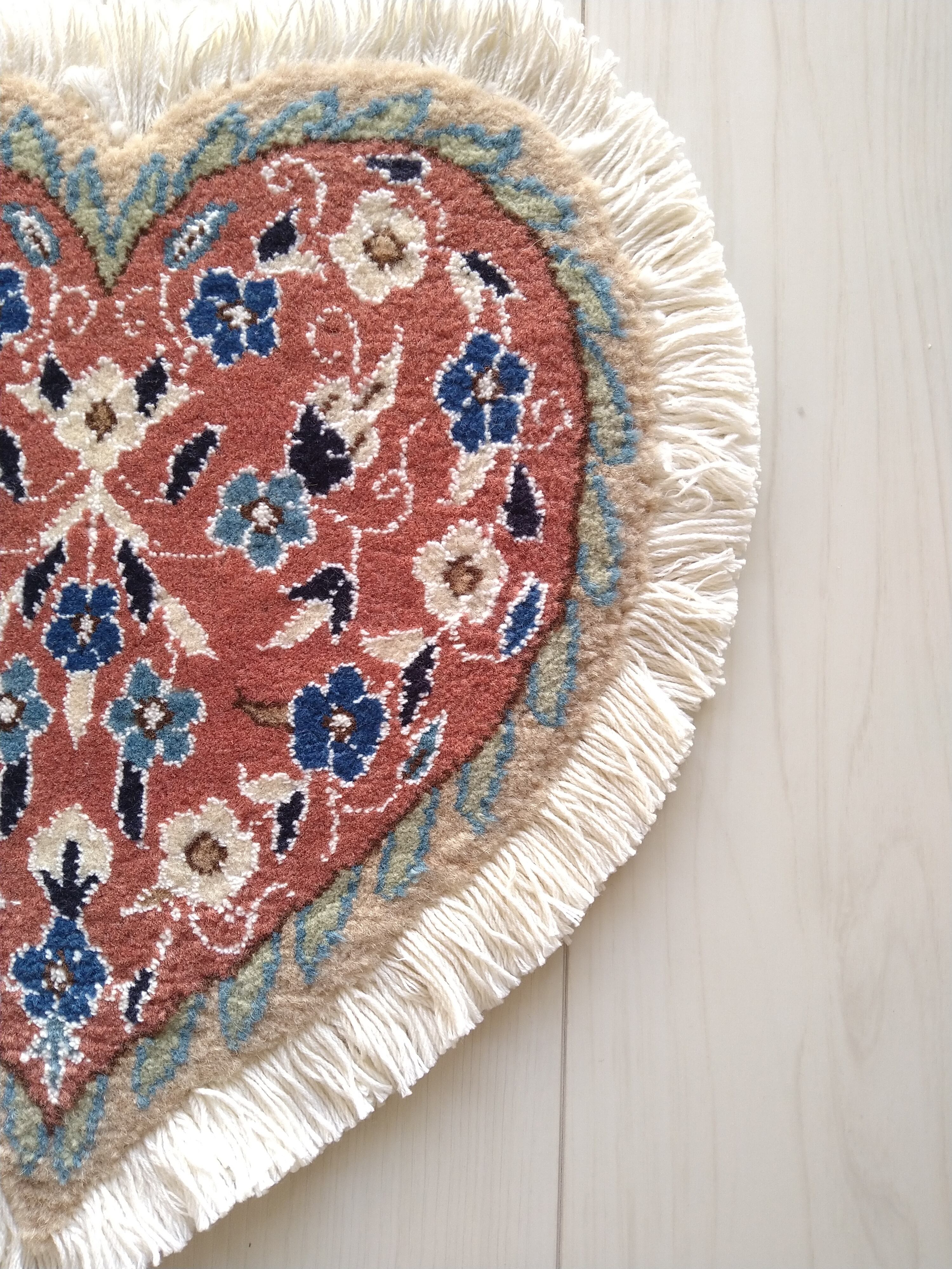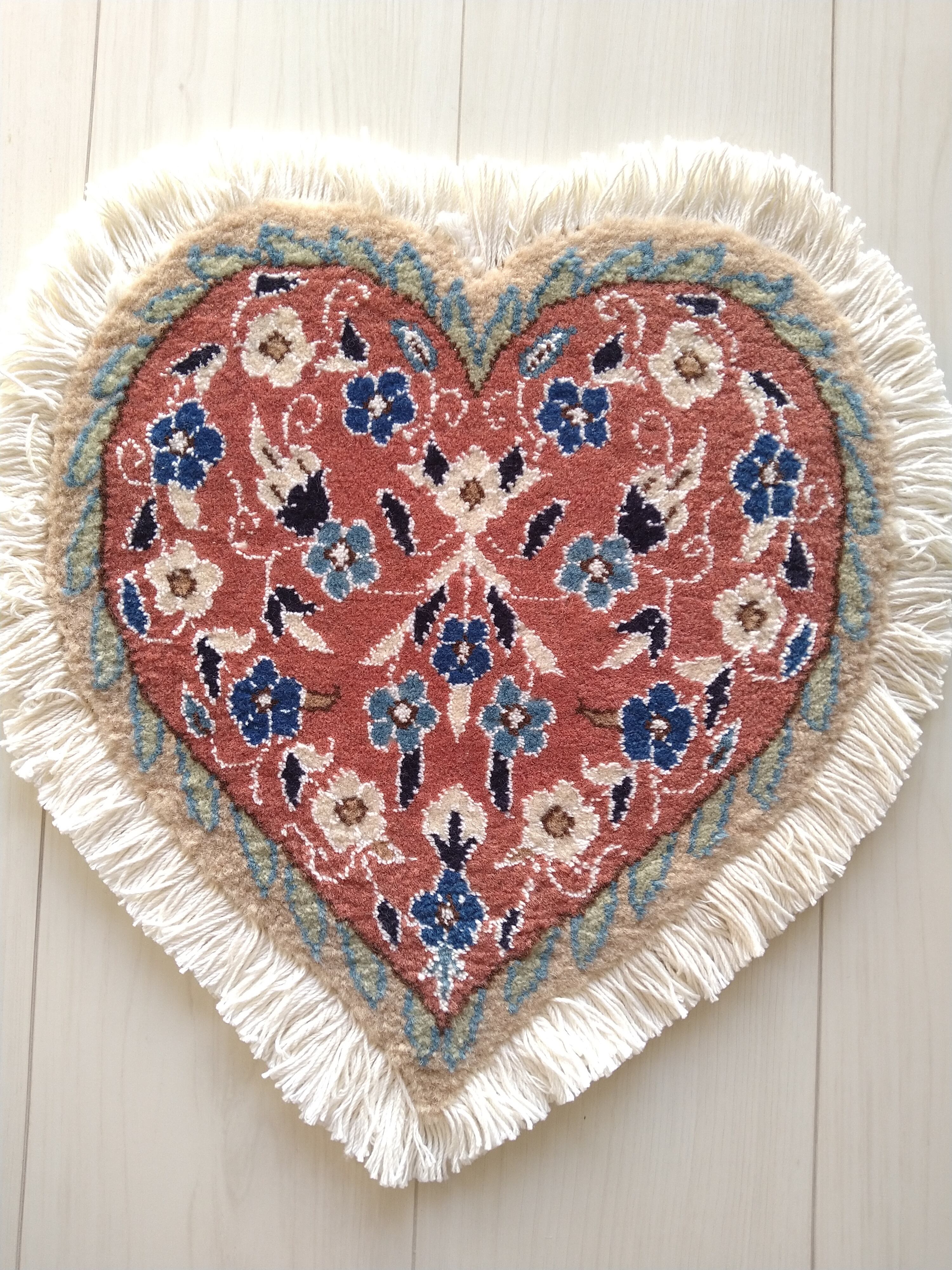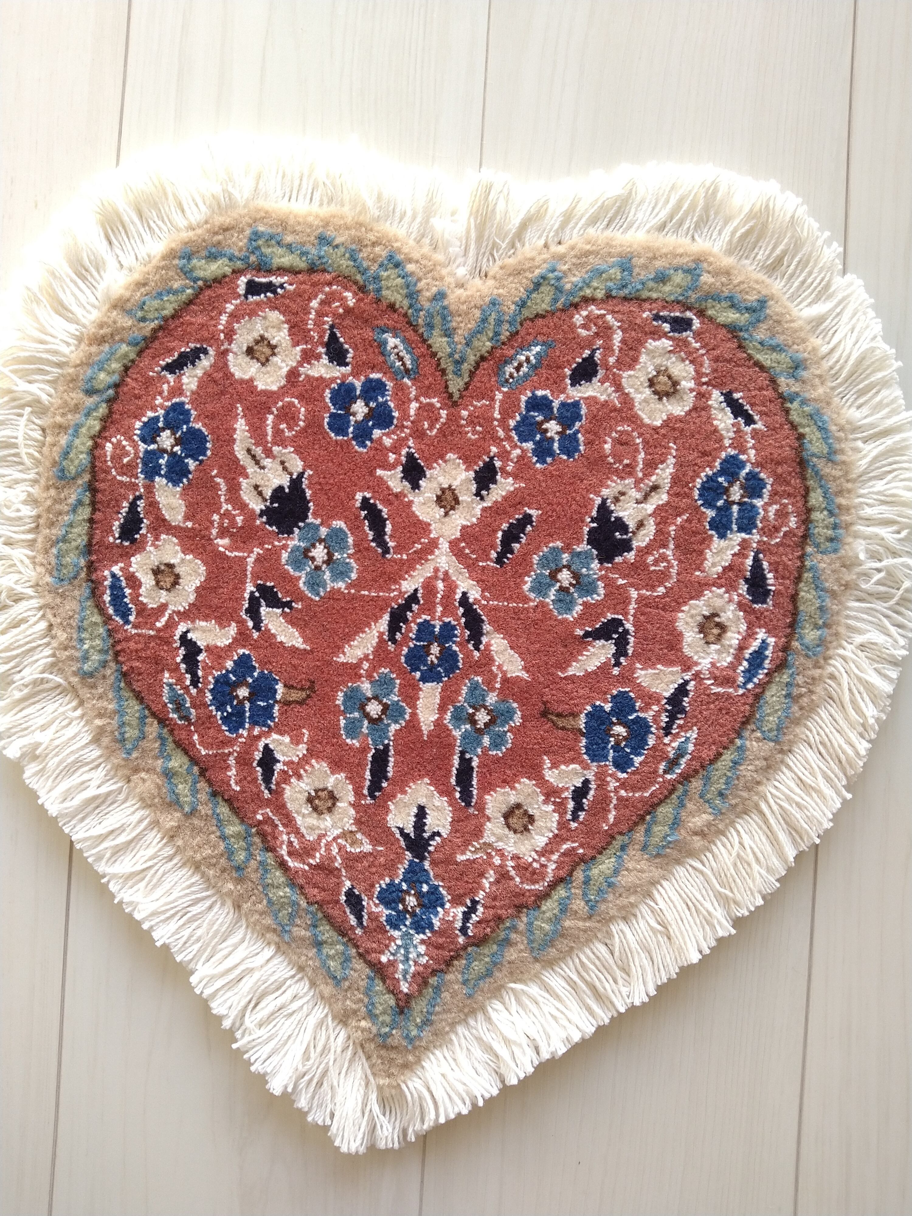ペルシャ絨毯の産地として世界的に有名なナインで大変丁寧に手織りされた、イラン製 ハート型 ミニペルシャ絨毯 / ミニラグです。