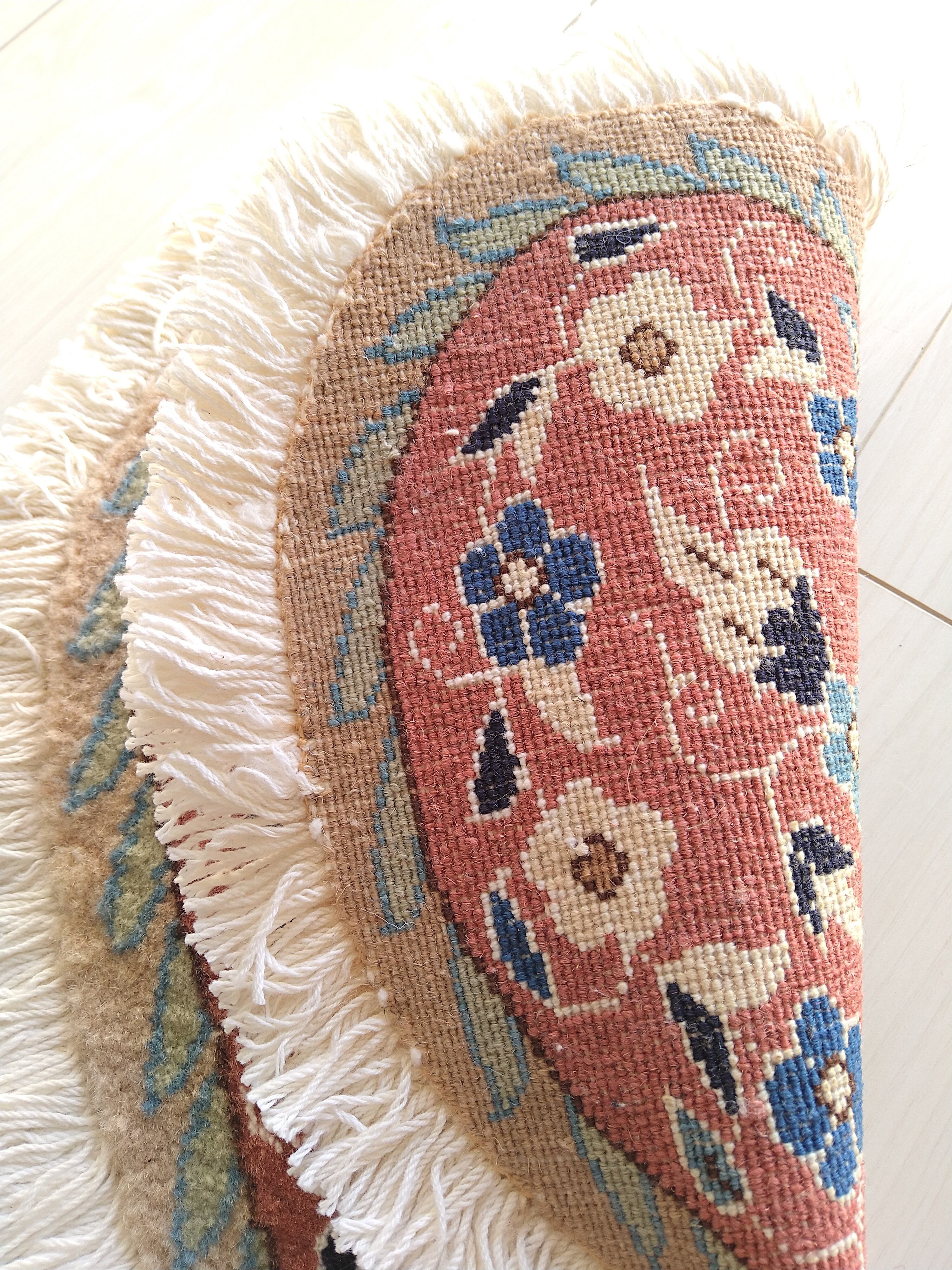 -ハンドメイドのラグは工場生産の既製品とは違いますので多少のゆがみ、色むらがあります。手織りの暖かみを楽しんでいただければ幸いです。