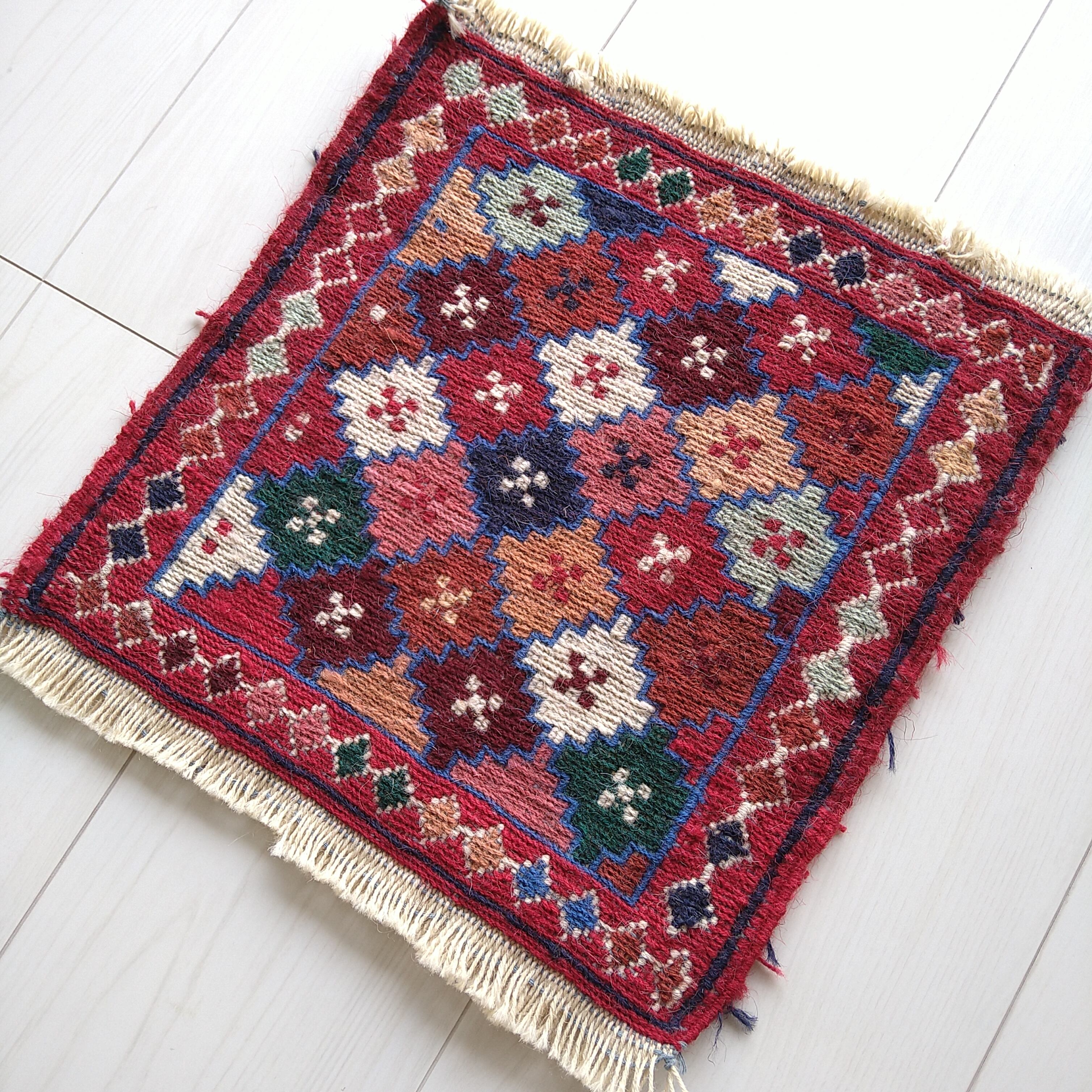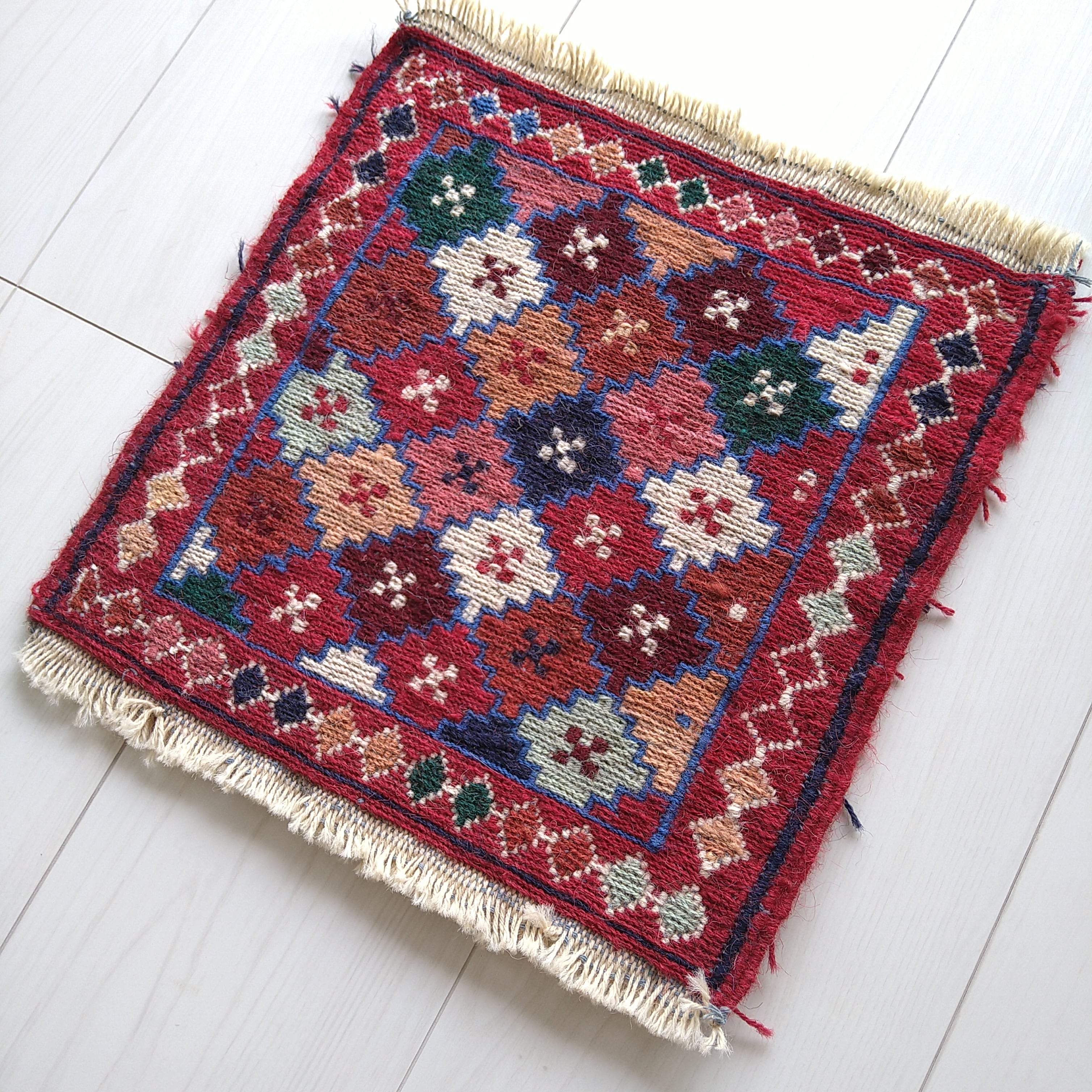 イラン北西部の都市、アルダビール近郊のヴィレッジで手織りされた、新品 スクエア ミニ キリム / ミニラグです。