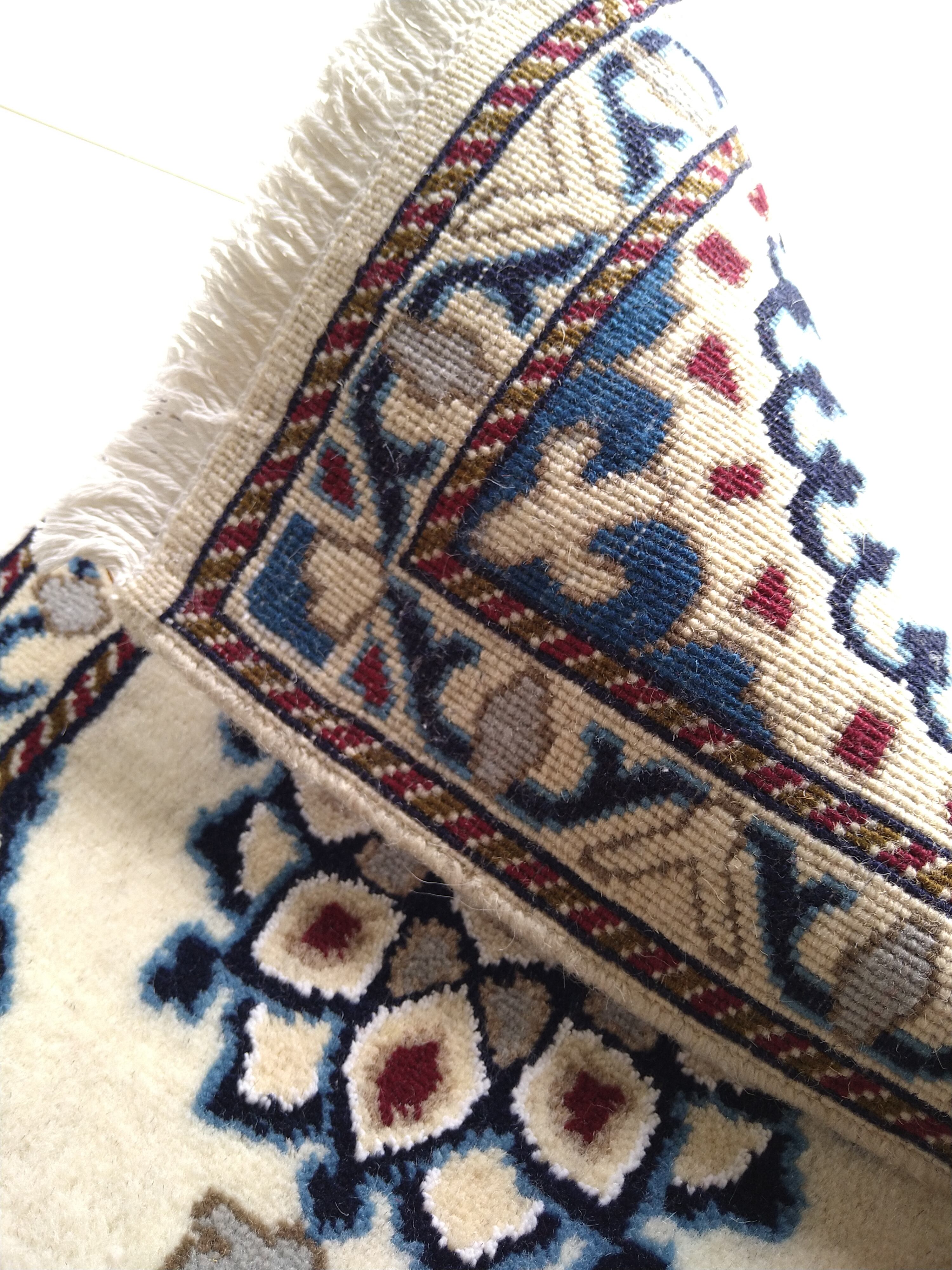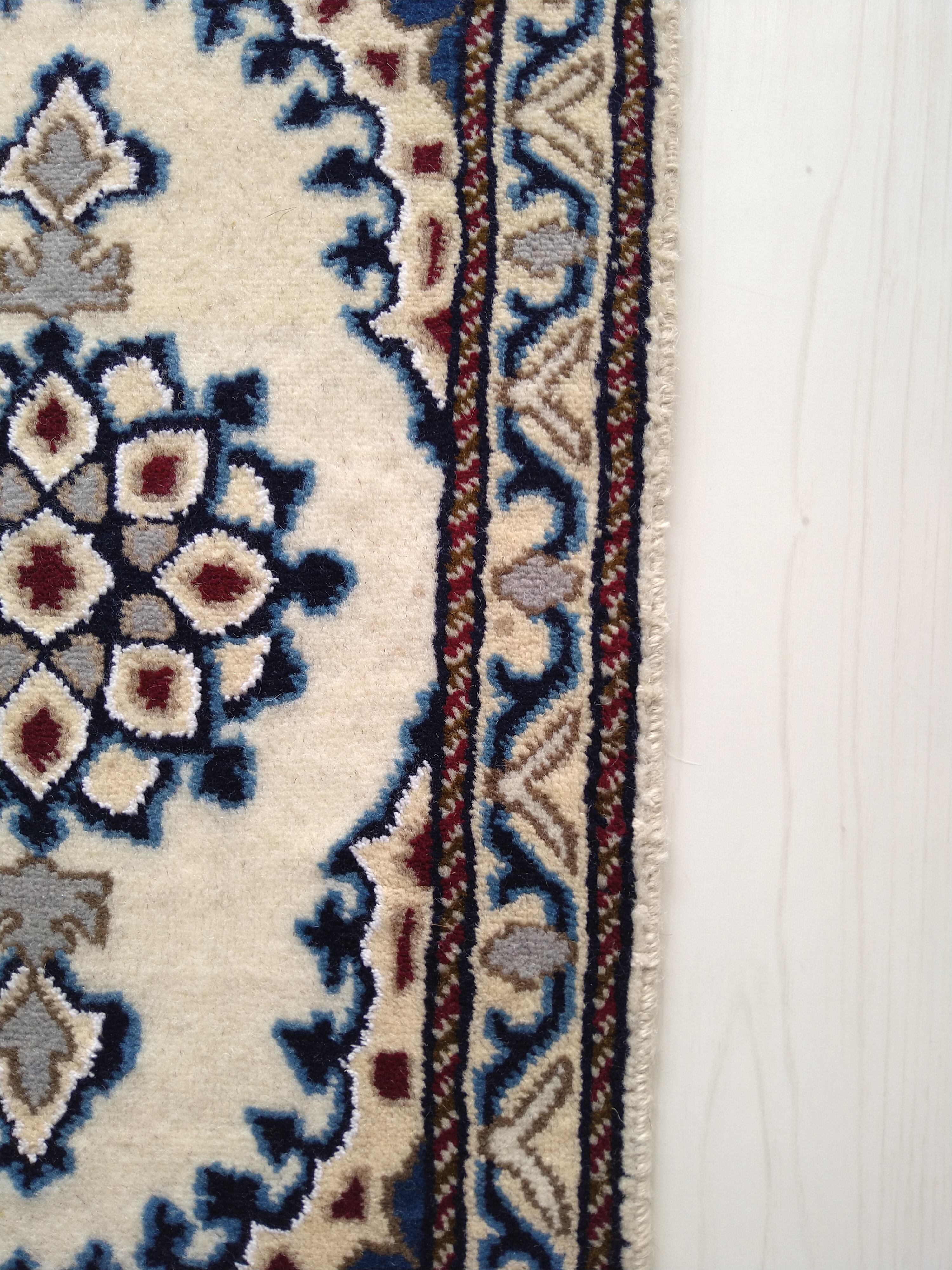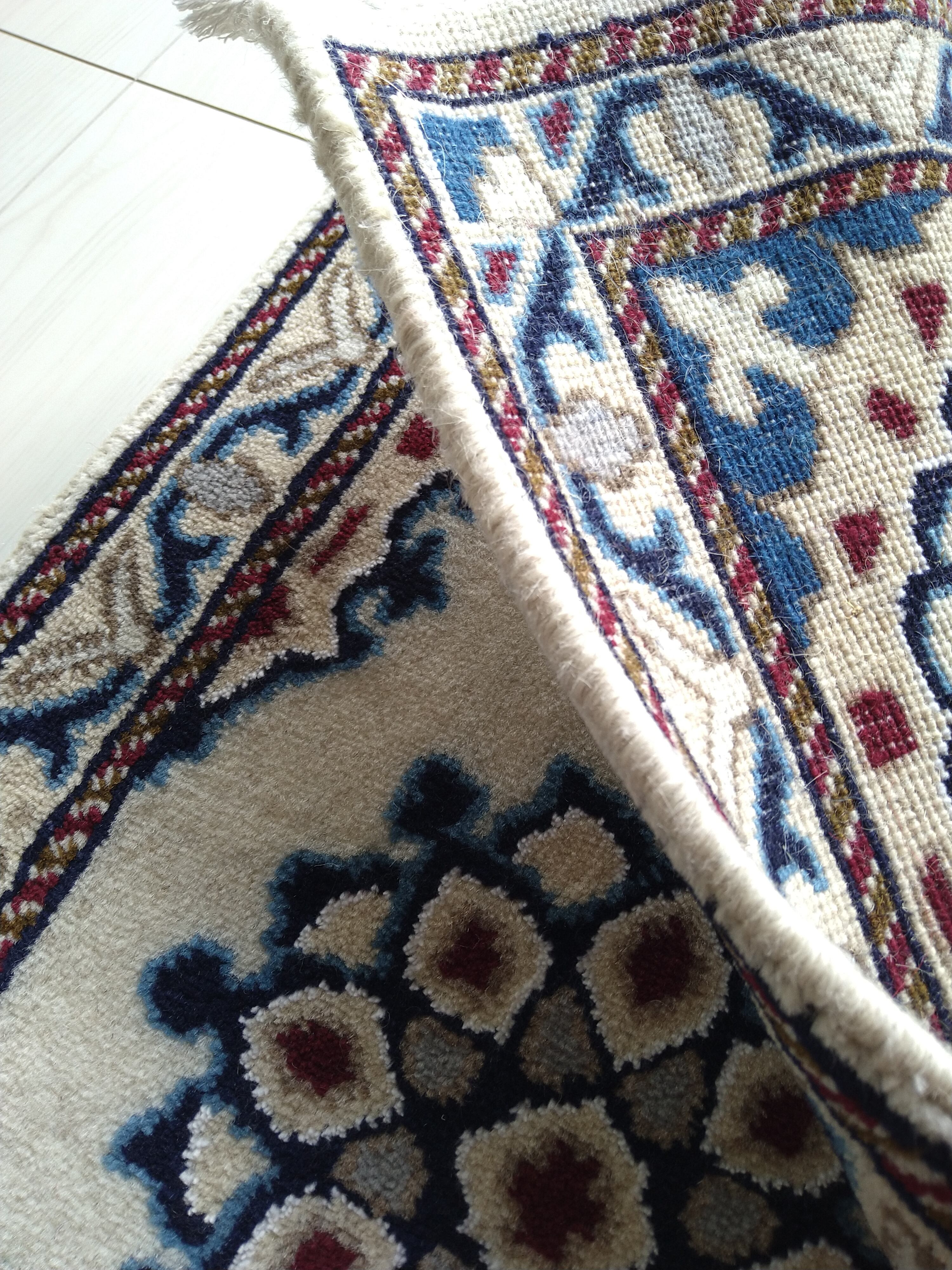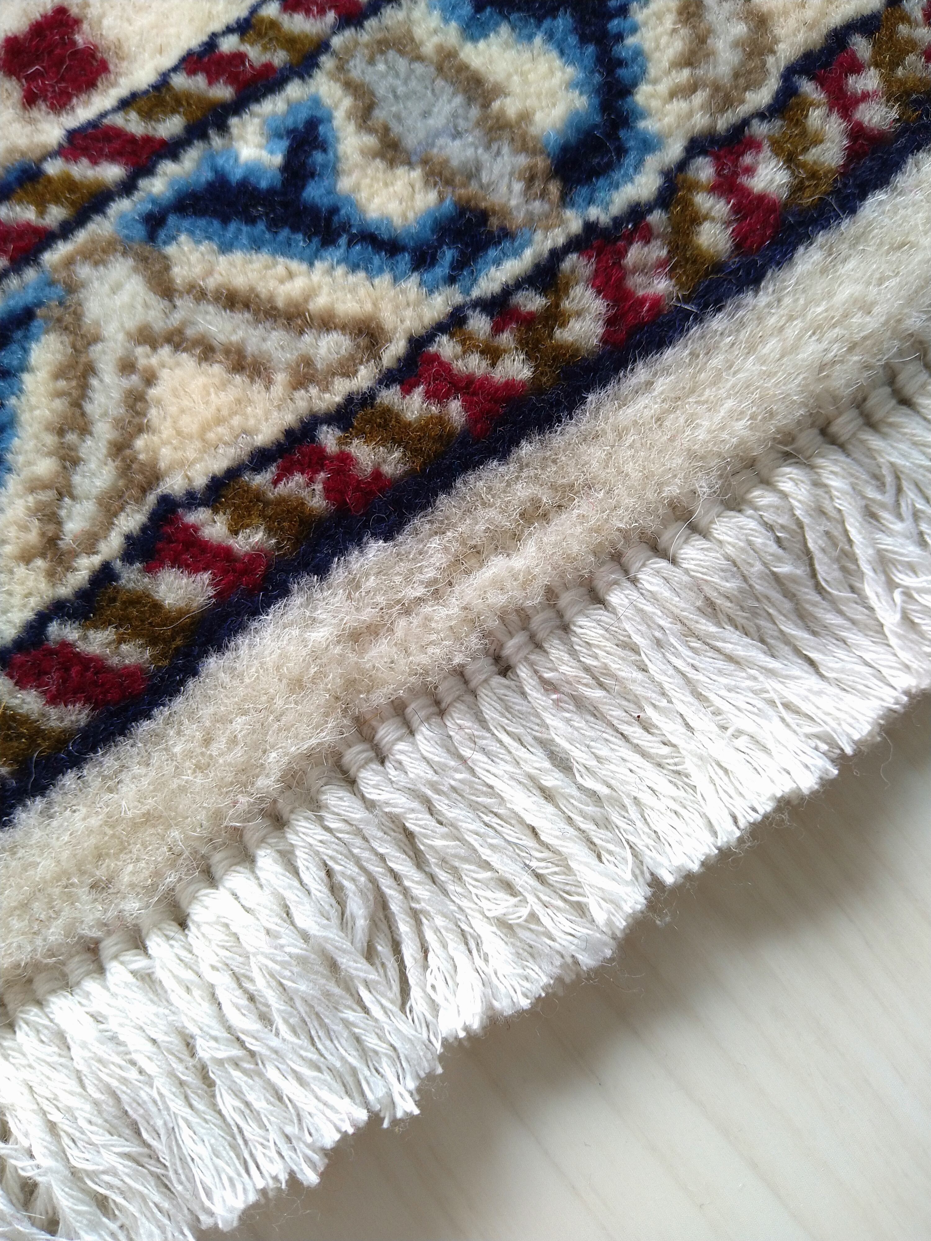 -ハンドメイドのラグは工場生産の既製品とは違いますので多少のゆがみ、色むらがあります。手織りの暖かみを楽しんでいただければ幸いです。