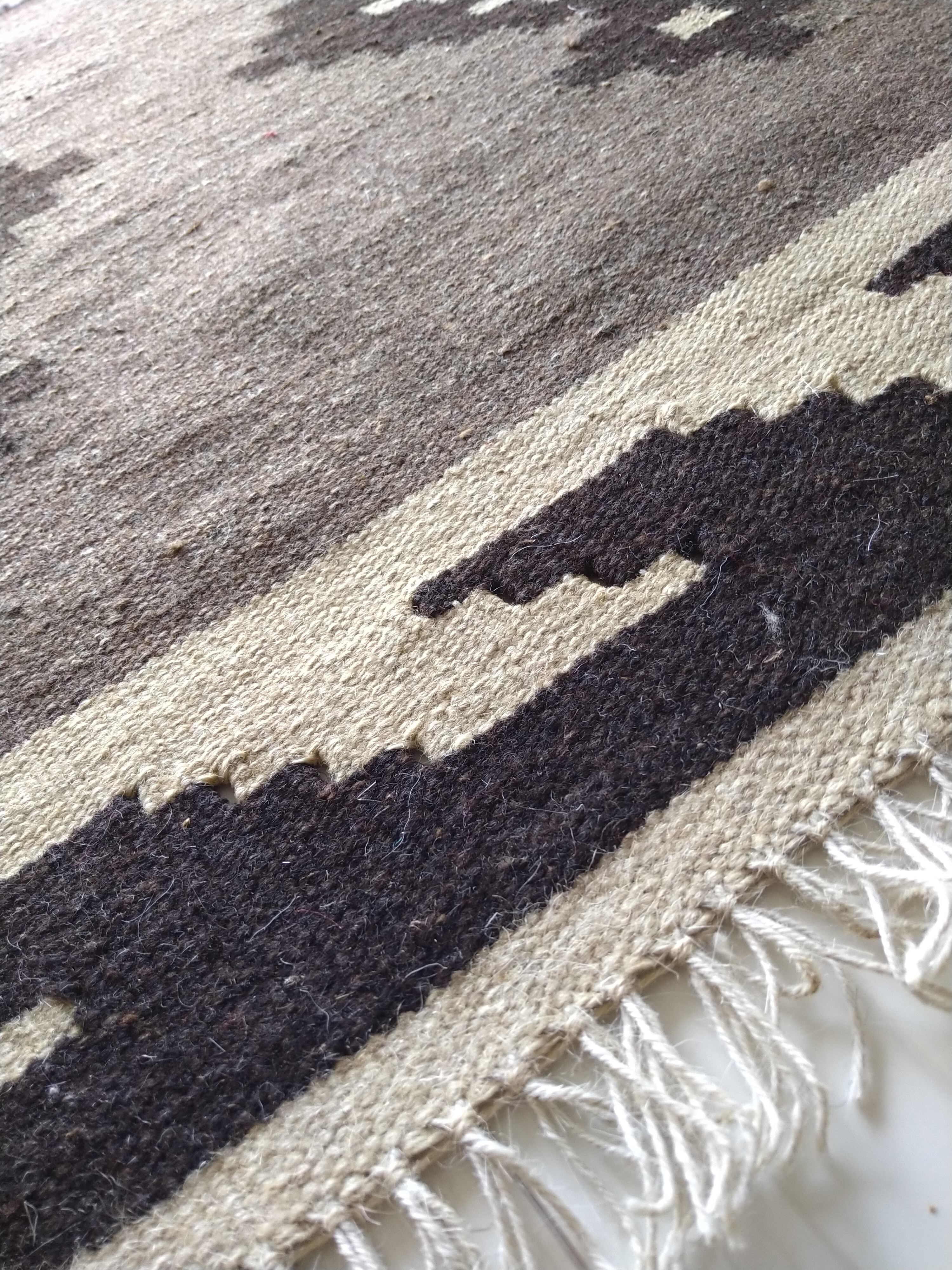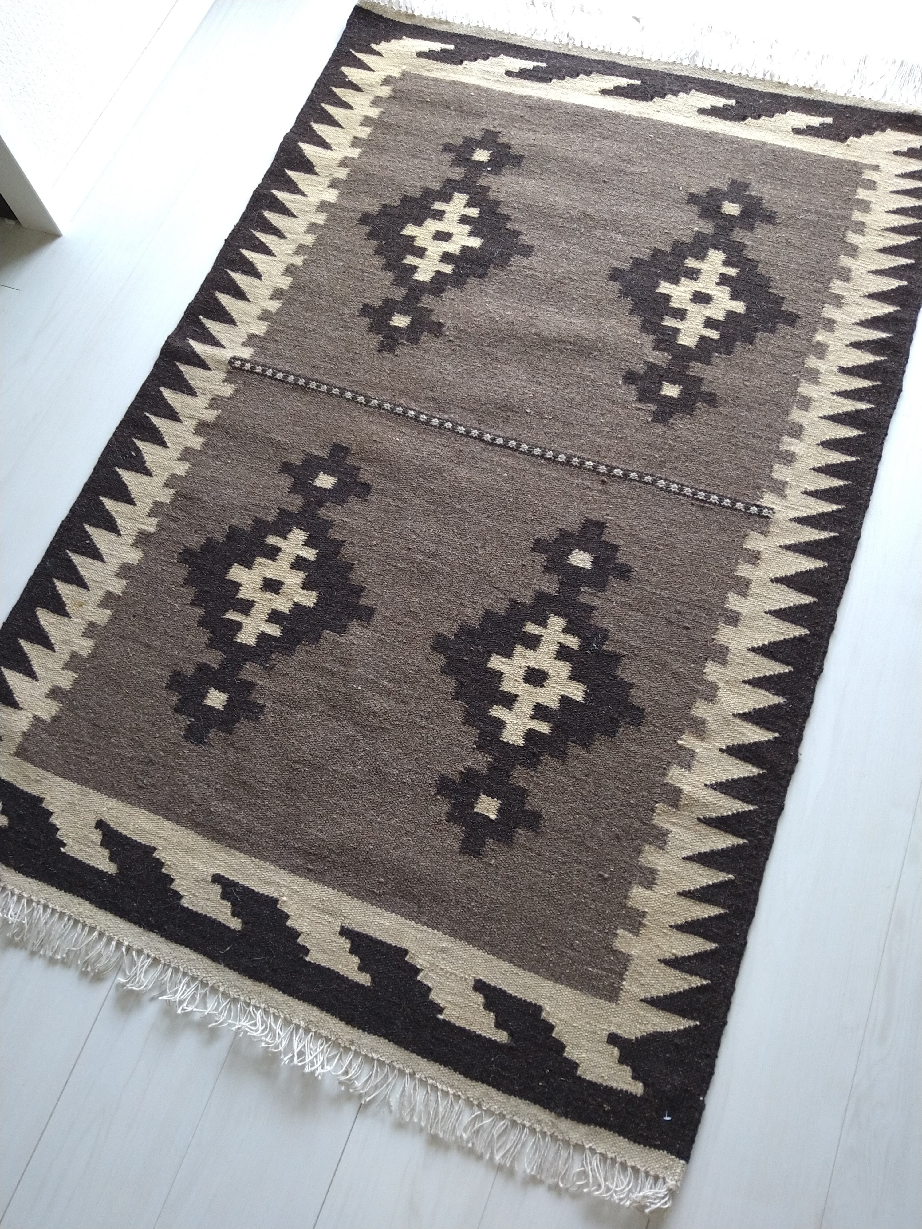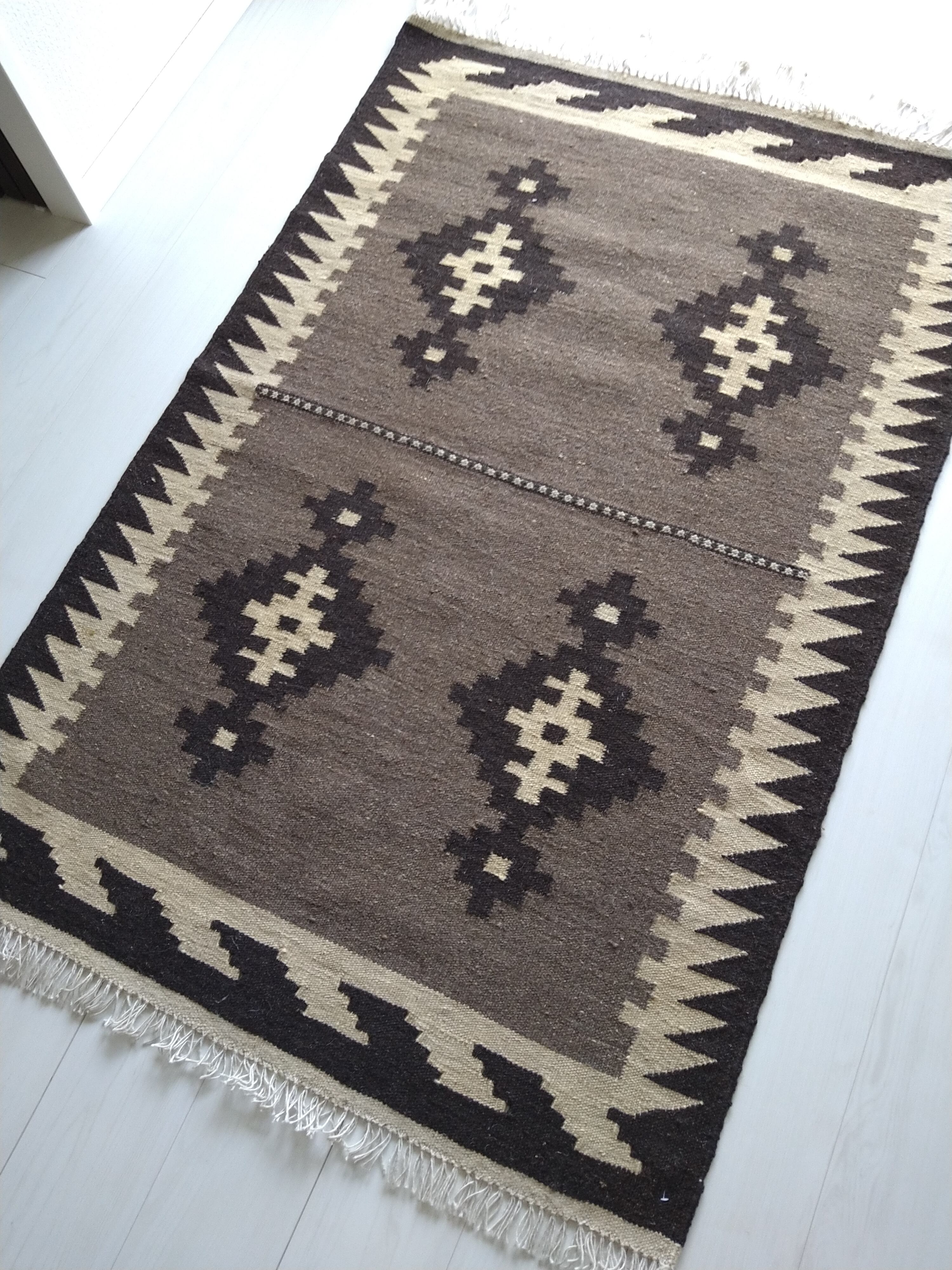シンプルな幾何学模様とナチュラルカラーがどのようなインテリアにもしっくり馴染みやすく、大変重宝する一枚です。