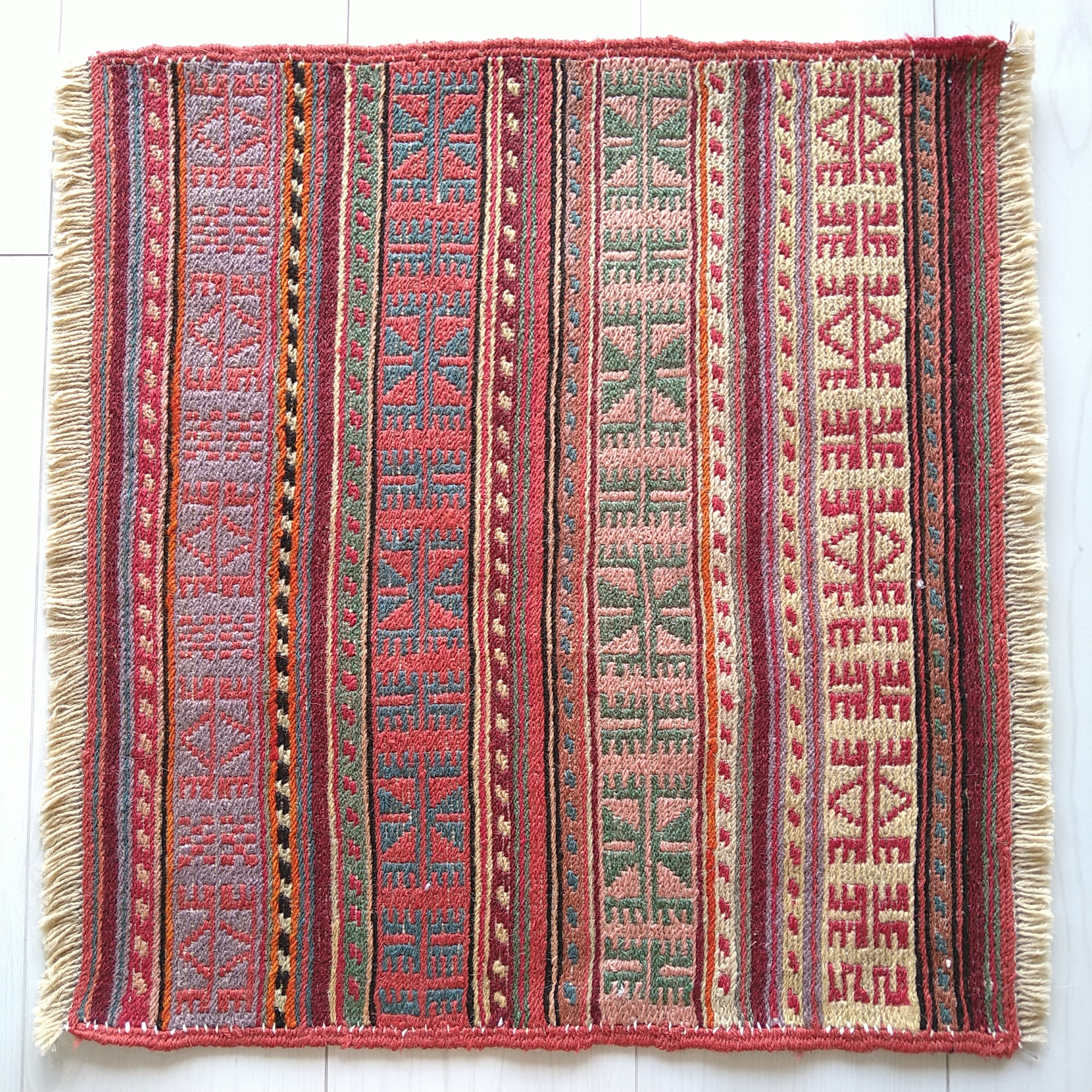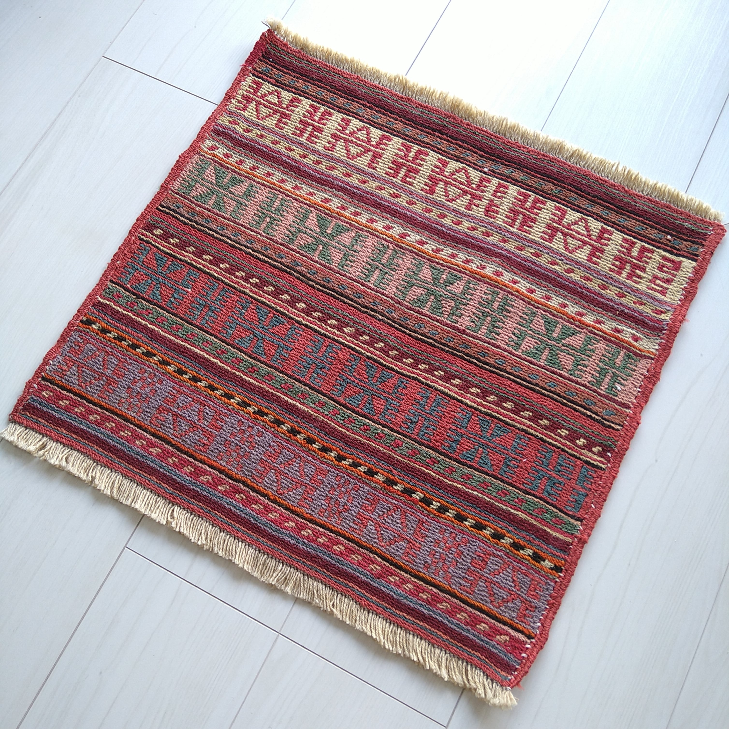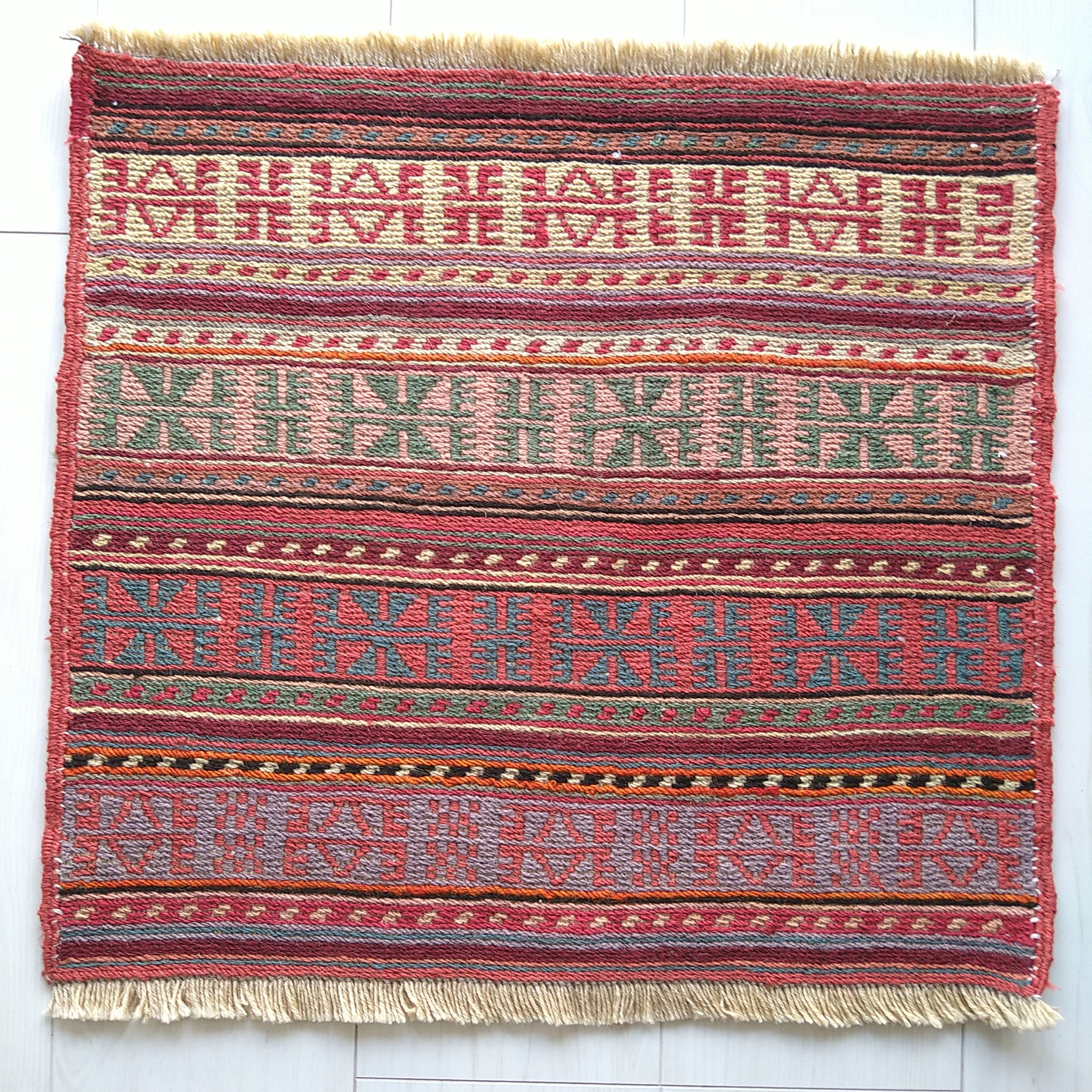 イラン北西部の都市、アルダビール近郊のヴィレッジで手織りされた、新品 スクエア キリム / トライバルラグです。