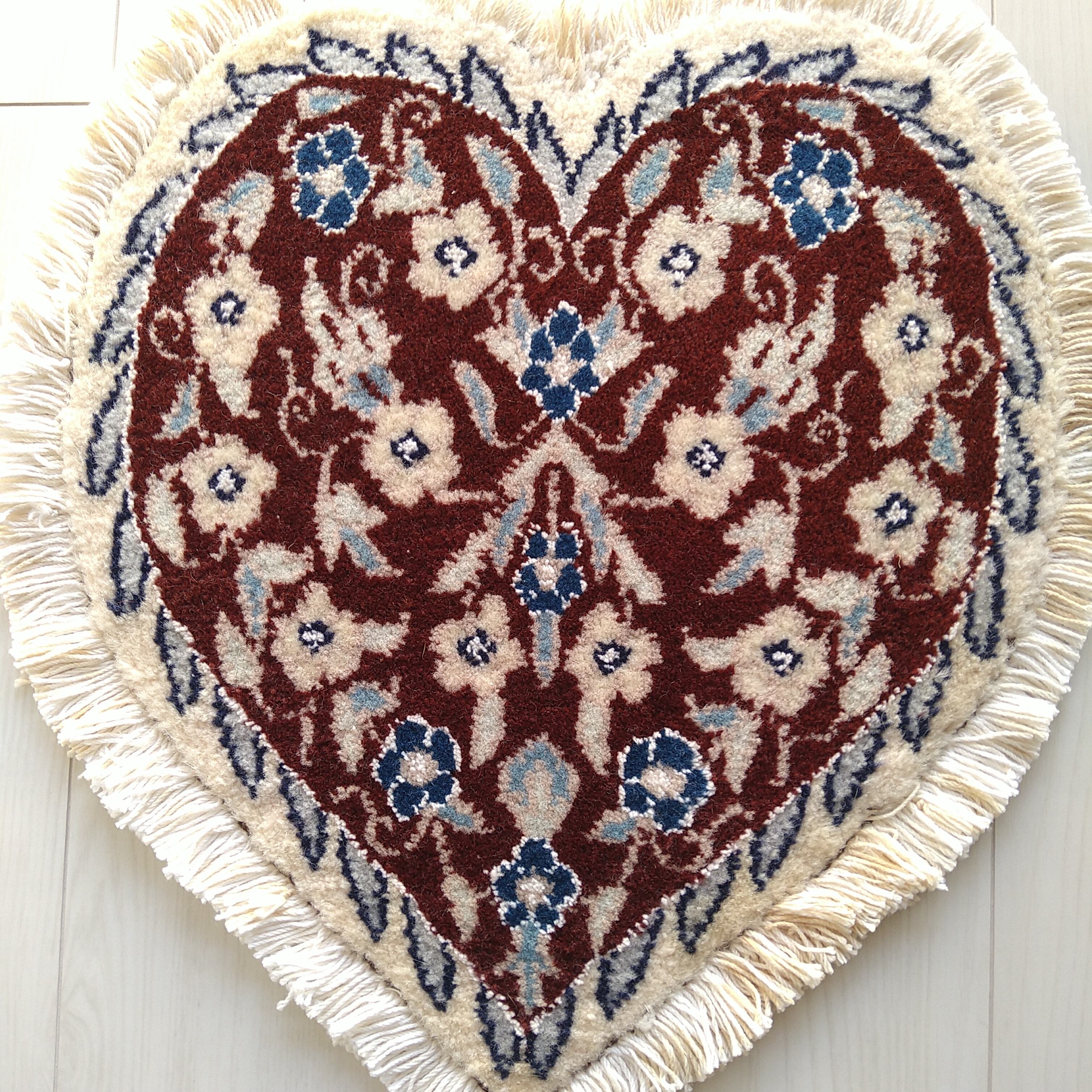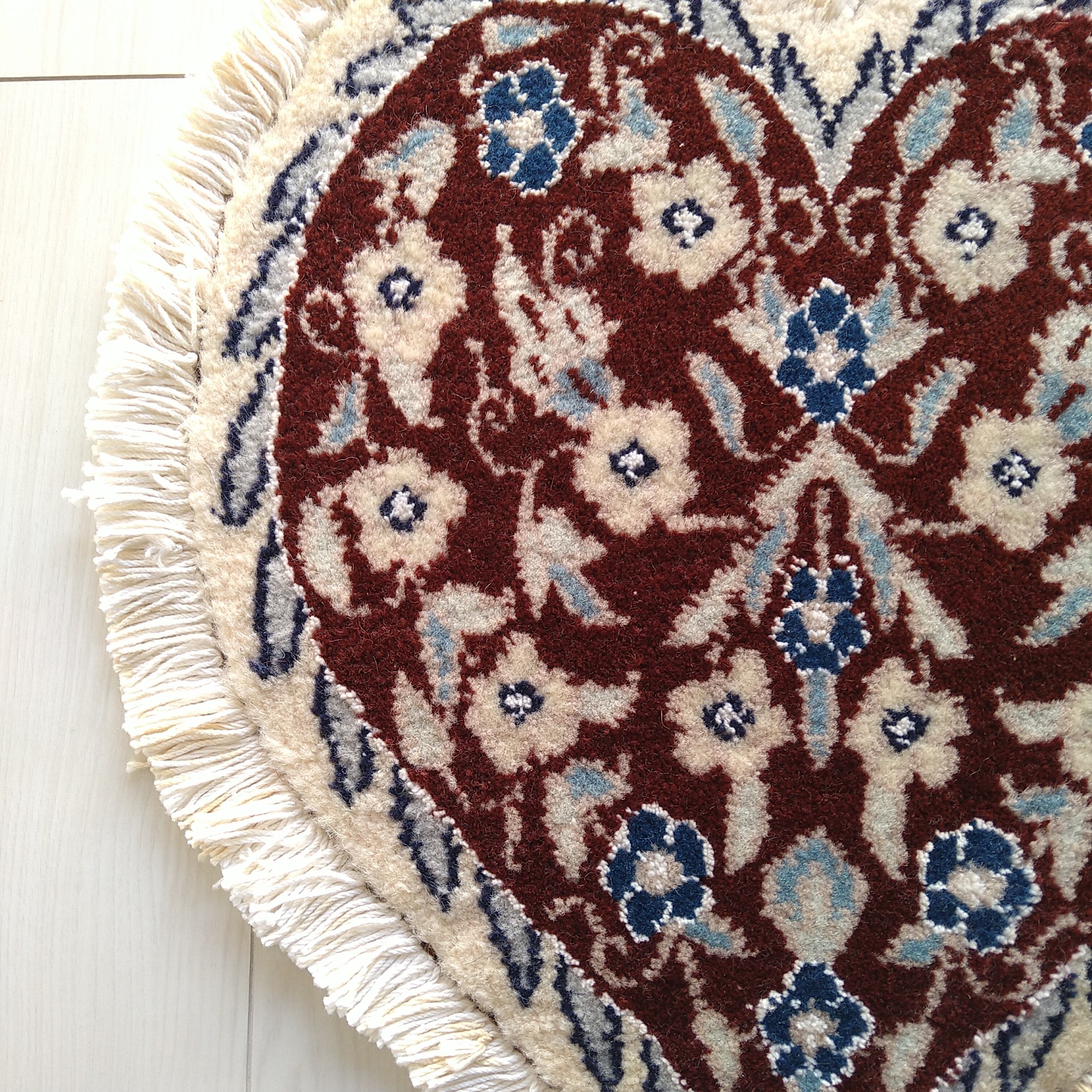 ペルシャ絨毯の産地として世界的に有名なナインで大変丁寧に手織りされた、イラン製 ハート型 ミニペルシャ絨毯 / ミニラグです。